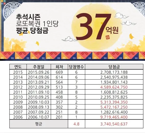어쨌든 2006년부터 2015년까지 추석 시즌 로또복권 당첨현황에 의하면 1등 평균 당첨자 수는 4.8명, 1인당 당첨금은 평균 37억원이라는 사실이 제발 나에게 오는 행운이었으면 하고 간절하게 빌어본다.