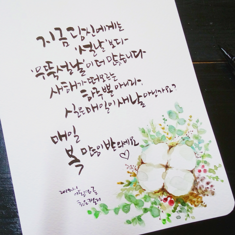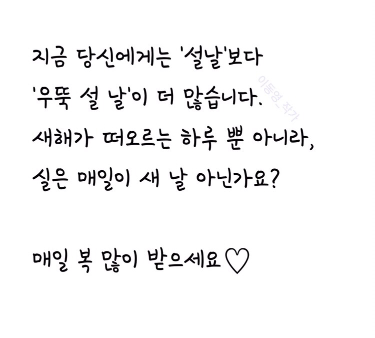 2018년 무술년 새해 인사말 새해 복 많이 받으세요 인사말 대신에..?! | 너무 열심히 살지 않아도 괜찮을 일상을 축복합니다.눈치 보고 경쟁하는 대신도전하고 돌파하며 느낄 다행함을 소망합니다.틈을 허락하는 하루하루가 모여여유로운 한 해를 이루는당신의 2018년이 되기를 바라고 또 바랍니다.돈에 얽매이지 않고 사람이 먼저인 전제로써무엇보다 자기 자신이 행복한 나날을 기원합니다.설렘을 위하여 몸과 마음을 바칩시다.부디 사랑합시다.(이