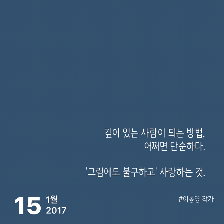 깊이 있는 사람이 되는 방법 사랑하라. 사실 그거면 된다. | 당신은 나를 더 나은 사람이 되고 싶게 해요 늘 양극곡선을 그렸던 내 감정이 유난히도 아무렇지 않은 날, 문득 명대사가 떠올랐다. 이 유명한 대사를 누군가에게 고백하고 싶다고 생각했다. 이내 그 날은 하루종일 아무나 붙잡고서 '당신을 사랑합니다-'말하고 싶은 날이 되었다. 바야흐로 첫사랑이 아닌 첫이별로 기록되는 날은 찾아왔다. 그것도 헤어짐이 한참 지