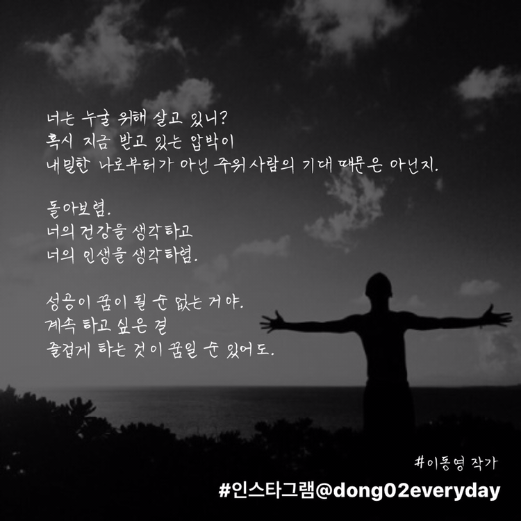 나는 흔해빠진 언어유희 위주의 말장난글이나, 뭔가 문장이라기엔 거시기한(예를 들어 O월에는 제발 행복했으면 좋겠다 시리즈같은..)감성글귀와는 다르다고 자부한다. 나도 언어유희 말장난이 있고, 혼잣말 같은 감성글귀도 쓰지만, 내 글을 자주 보는 독자들은 알 것이다. 좀 더 깊게 생각해보며 깨달을 수 있는 아포리즘을 공유하고자 한다는 것을 말이다.