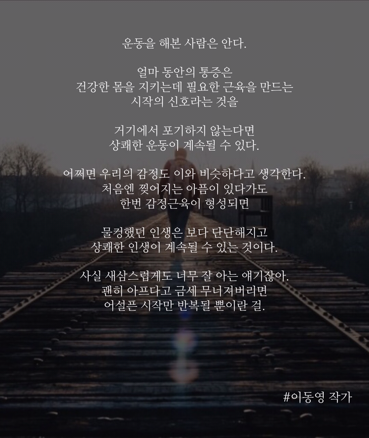 운동처럼, 고통의 감정을 만드는 경험도 자꾸 단련되는 과정 속에서 그간의 실수마저 다시 교정될 거야. 무뎌지는 게 아니라, 몸에 배는 거지. 몸이 기억하는 거야. 감정도 비슷해. 마음이 기억해. 스며들면 내 것이 되는 거야. 내 것이란 건 얼마나 소중한 지!