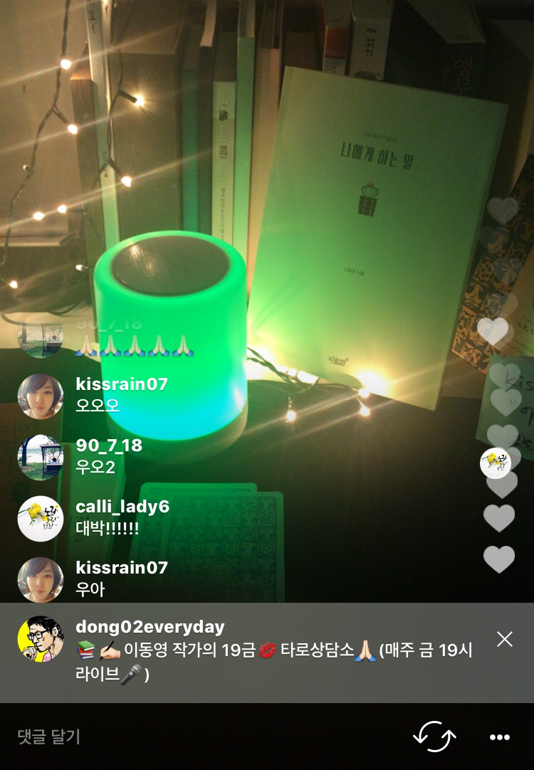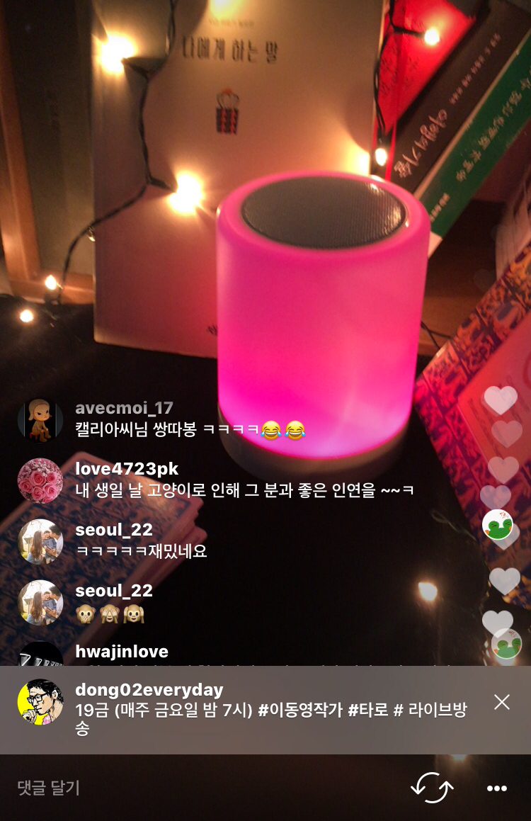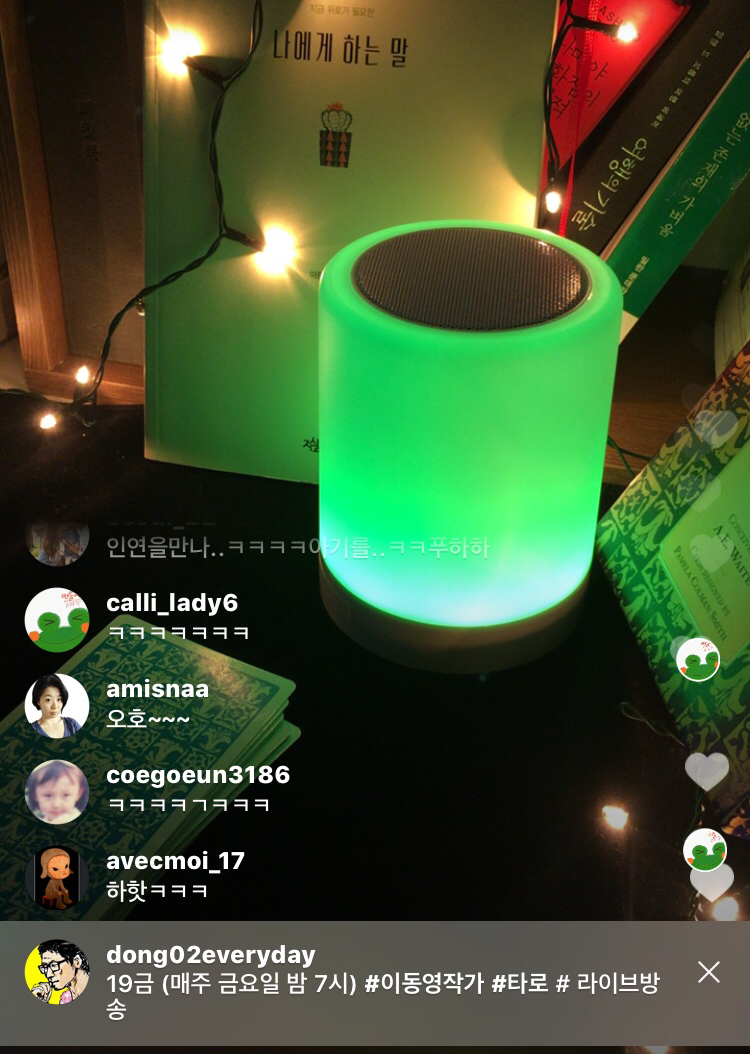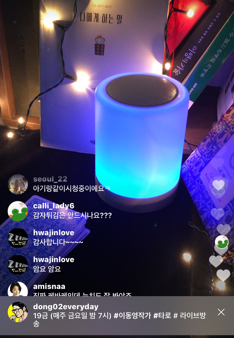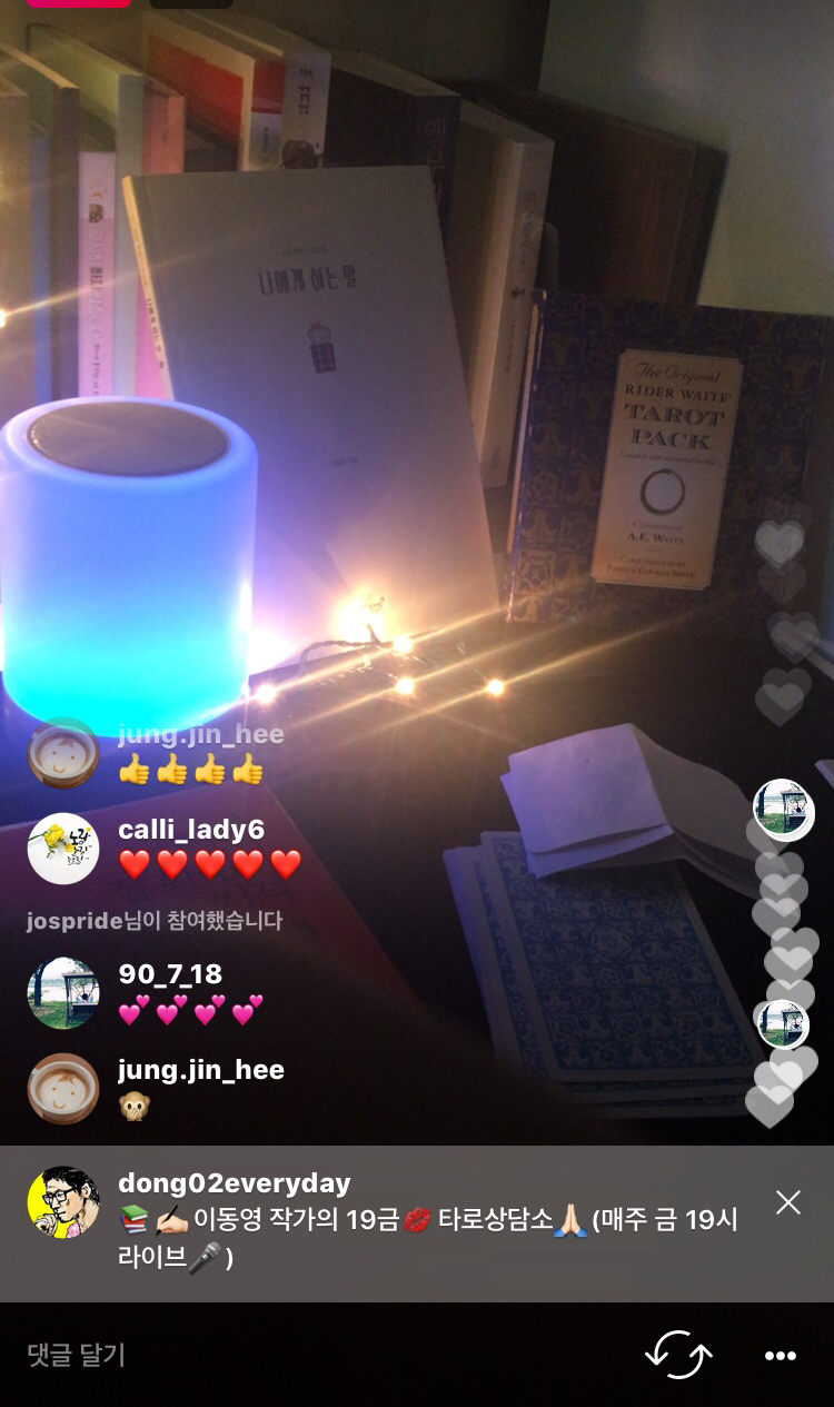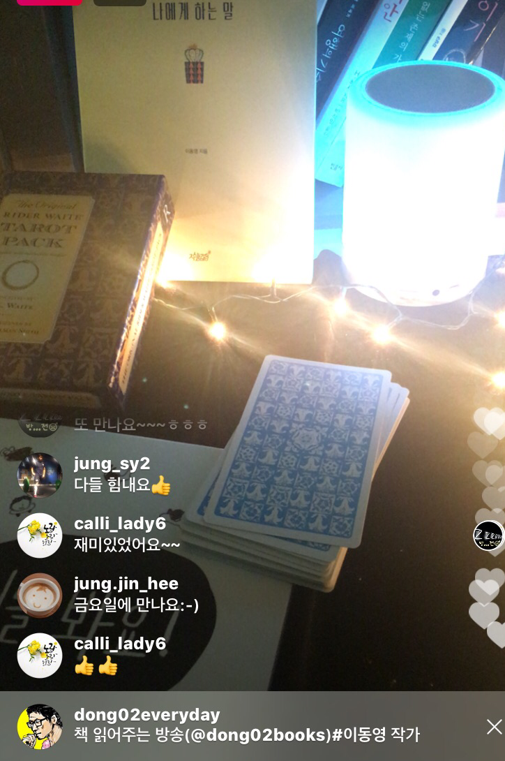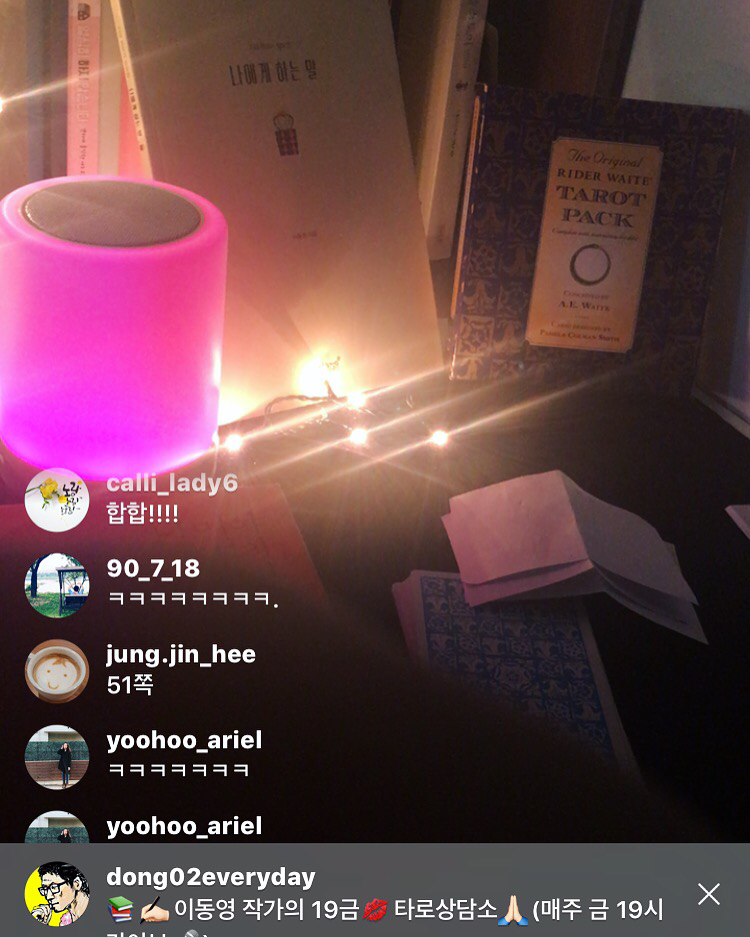 이동영작가의 인스타그램 라이브방송은(@dong02everyday) 타로상담은 물론이고 책점, 단어점, 중간에 튕기시면 빙의타로 (ㅎㅎ)도 함께 합니다.