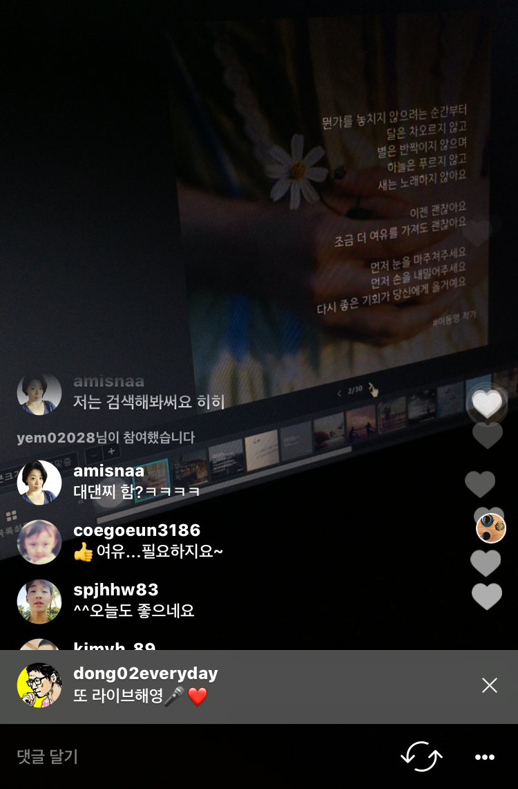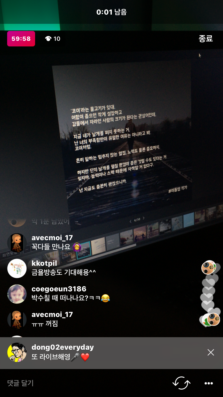 이 글을 보시는 강연이나 방송 등의 오거나이저 분들은 언제라도 연락주시기 바랍니다. 브런치 독자분들 중에서도 인스타그램에 접속하시면 (@dong02everyday)팔로우 해주시고 방송도 찾아봐 주세요:)