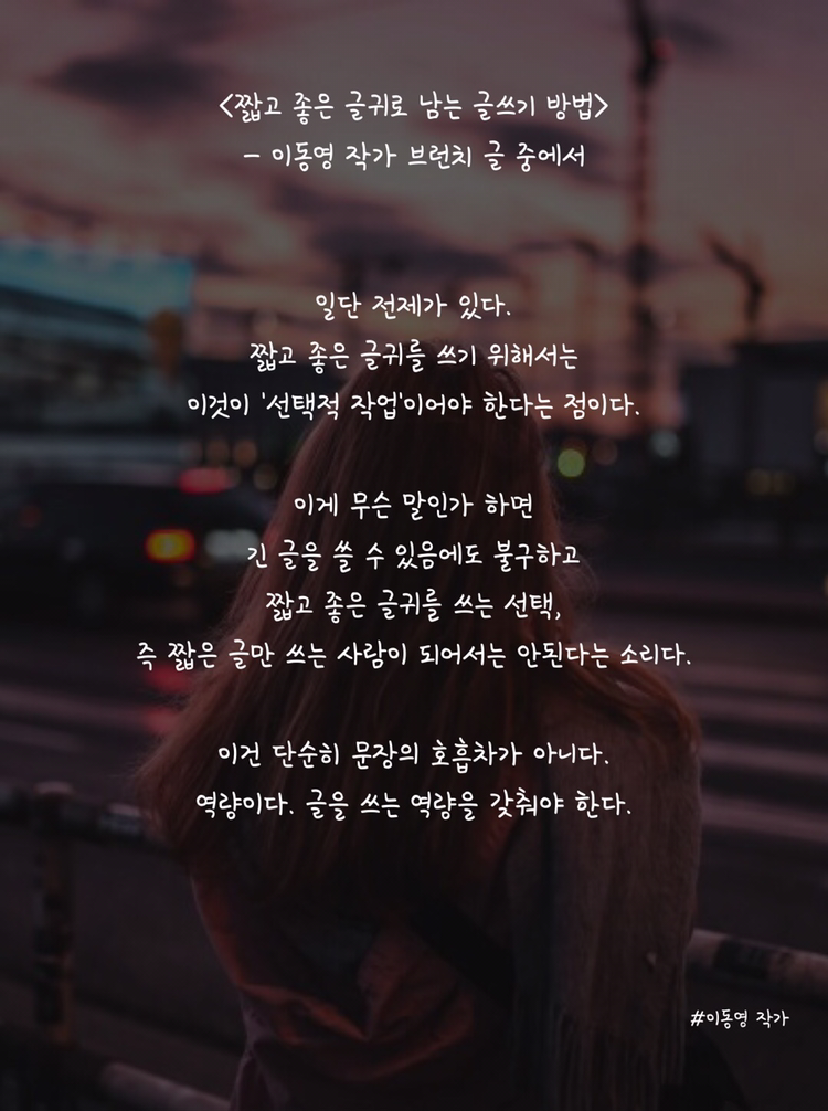 짧고 좋은 글귀로 남는 작법 SNS가 있는 한 써먹을 만할 걸? | 일단 전제가 있다. 짧고 좋은 글귀를 쓰기 위해서는 이것이 '선택적 작업'이어야 한다는 점이다. 이게 무슨 말인가 하면 긴 글을 쓸 수 있음에도 불구하고 짧고 좋은 글귀를 쓰는 선택, 즉 짧은 글만 쓰는 사람이 되어서는 안된다는 소리다. 이건 단순히 문장의 호흡차가 아니다. 역량이다. 글을 쓰는 역량을 갖춰야 한다.필자 역시도 긴 글보다는 어느샌가 이미 짧