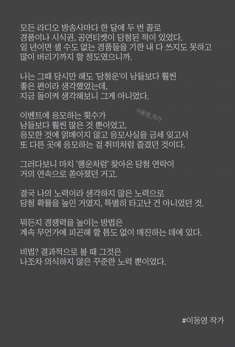 사연이나 이벤트에 응모하는 횟수가 남들보다 훨씬 많은 것 뿐이었고, 응모한 것에 얽매이지 않고 응모사실을 금세 잊고서 또 다른 곳에 응모하는 걸 취미처럼 즐겼던 것이다. 그러다보니 마치 '행운처럼' 찾아온 당첨 연락이 거의 연속으로 쏟아졌던 거고.
