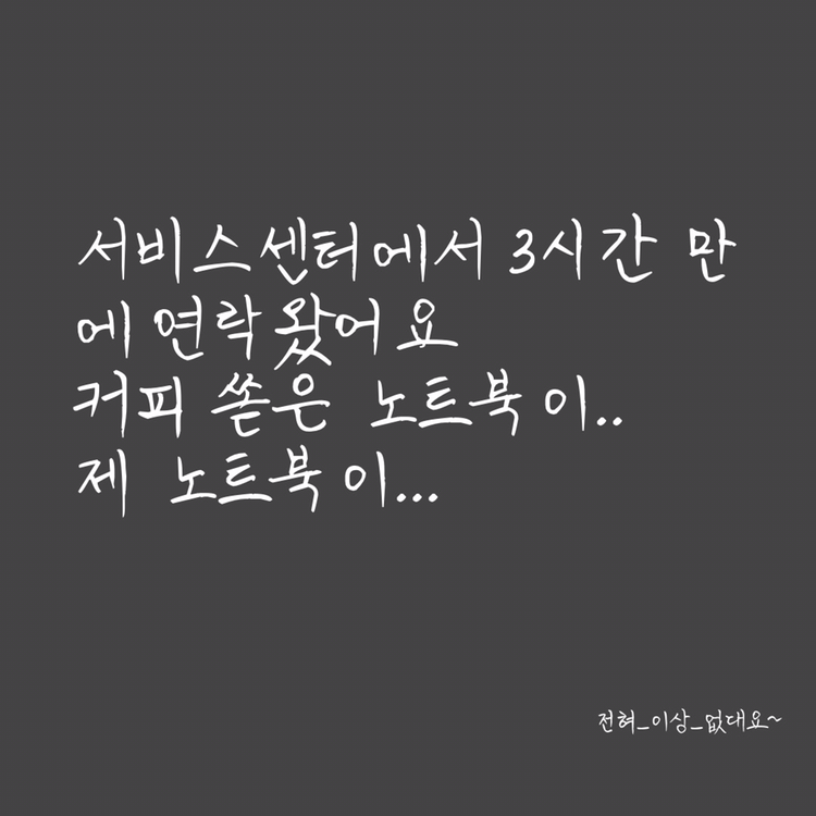 기본 메모장 프로그램에 저장 안 하고 계속 절전모드로 며칠동안 작성하던 텍스트는 비록 날아갔지만.. 그 외의 모든 것이 정상작동. 쏟은 커피값 + 서비스센터 서비스비용 + 그 앞에서 대기 중 사먹은 카페 음료값과 부랴부랴 잡고 간 택시비용까지 다 합해서 약 3만원이 소요됐다. 노트북을 새로 샀다면 거의 백만원 가까운 비용이 들었을 것이다. 게다가 형이 사준 선물의 의미도 추억 속으로 바이바이였을 것이다. 아아 착하게 살아야겠다.