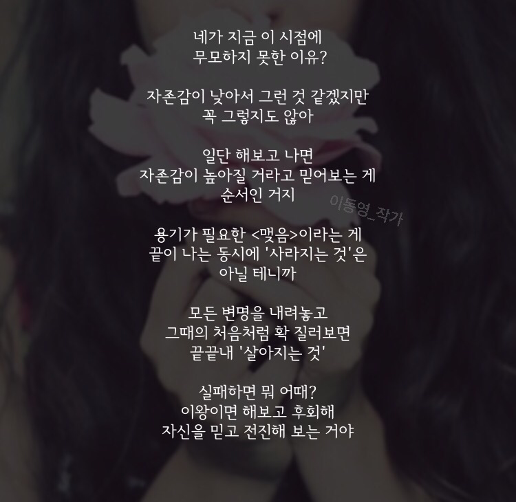 동영아, 일단 해봐. 실수는 시행착오로 줄여가는 거야. 첨부터 잘하는 사람이 세상에 어딨니? 동영이 넌 잘할 거야. 그리고 만약에, 잘 안 되고 실패하면, 뭐 어때?