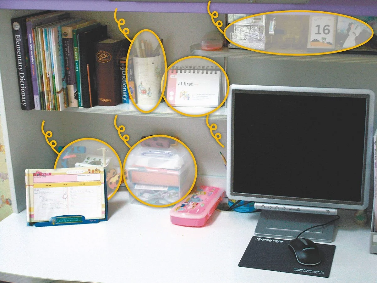 학습의 ‘무대’가 되는 책상 위는 필기구 정도만 남기고 비워주는 게 좋습니다. 시선이 닿는 책상 위나 앞에는 호기심을 유발하는 잡동사니를 두지 않아야 아이의 주의력이 흩어지지 않고 집중력이 올라가거든요.