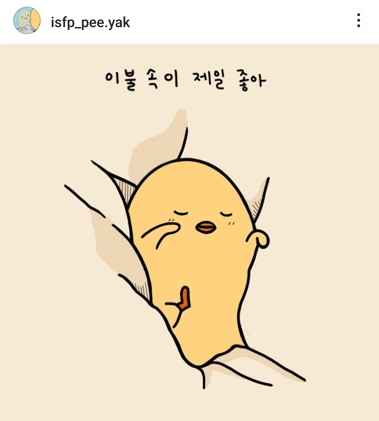 내 MBTI는 ISFP이다. 아래 캐릭터처럼 계획 없이 침대에 누워 유튜브를 보는 것을 제일 좋아한다. 이런 성격의 소유자도 4개월째 매일 하고 있는 것이 있다. 10,000보 걷기이다. 게으름쟁이 ISFP가 침대를 벗어나 매일 10,000보씩 걸었던 원동력은 두 가지다. 산책을 일상생활과 연결 짓는 것과 몇 개월 동안 10,000 보를 걸었다는 기록을 깨는 것이 아까워서다.