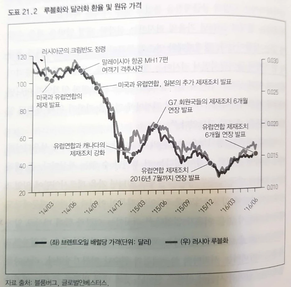 원유와 천연가스 사업으로 호황은 계속됐으며 일반 러시아 가계의 소비는 경제 위기 이전 수준으로 회복되어 연간 10퍼센트씩 뛰어올랐다. 2007년이 되자 최저 생계 수준 이하로 살고 있는 국민들의 수가 14퍼센트까지 떨어졌으며 더 이상 달러화에 매달리는 불안정한 상황도 사라졌다. 물가는 안정되었고 무엇보다 이제는 달러화가 기준이 아니었다. 세금은 루블화로 납부했다. (...) 2008년 초가 되자 이 자산 규모는 5500억 달러에 이른다. 이제 중국과 일본의 뒤를 이어 러시아가 세계 3위의 달러화 보유국이 된 것이다. p.198