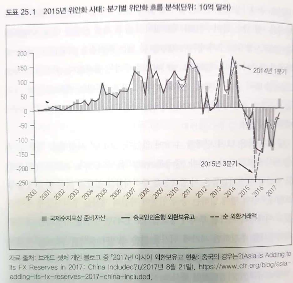 2014년 여름 최대 4조 달러에 달했던 중국의 외환보유고는 2017년 초에는 3조 달러로 줄어들었다. 매월 수백억 달러가 빠져나가는 상황을 지켜보는 건 대단히 초조하고 조마조마한 일이었지만 결국 어느 정도 선에서 외환보유고는 안정되었다. 2016년 초 국내 수요를 되살리기 위해 중국 정부는 민간 부문에서 재정 부양 조치를 통해 또 다른 신용 호황이 일어나도록 유도하고 동시에 과잉 설비가 가장 문제가 되는 중공업 부문을 정리하기 시작했다. (···) 이에 반응이라도 하듯 아시아 전역에서 원자재 가격이 상승하고 제조업이 늘어났으며 중국의 막대한 제조업 분야도 위기에서 벗어났다. 글로벌 디플레이션의 위협도 수그러들었다. p.838-839