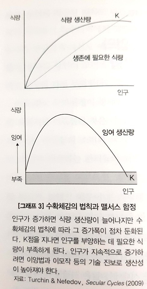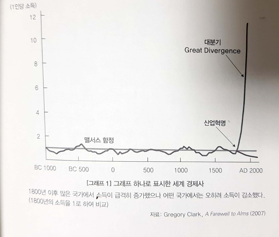 아무래도 이 책은 전근대 시대에 대한 낭만적인 생각을 파괴하는 악역을 담당할 것 같다. 산업혁명으로 근대 경제성장이 시작되기 이전의 사회는 '맬서스 함정'에 빠져 있었다고 보기 때문이다. 기술 진보의 속도가 느렸기 때문에 경제성장이 이루어지더라도 인구 증가로 인해 생활수준의 지속적인 상승은 거의 불가능한 시대였다. 우리는 식량 생산이 인구 증가를 따라가지 못해 기근이 반복되는 세계를 쉽게 상상항 수 없다.