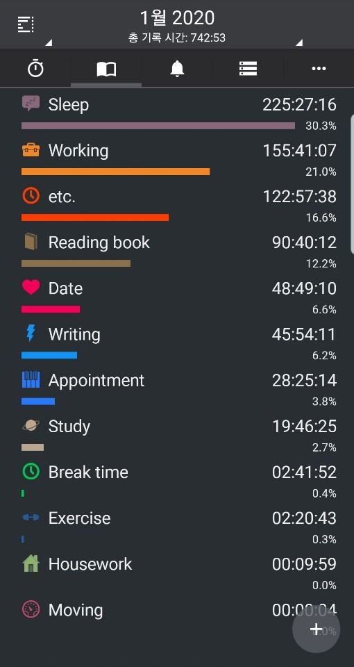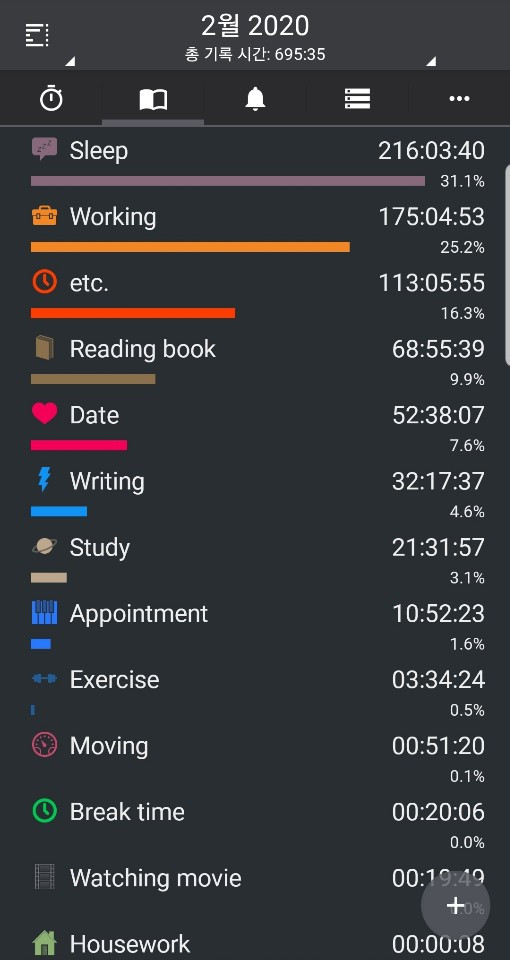 앱을 이용하여 시간을 기록합니다. 목표를 달성했는지 여부를 통계적으로 살펴볼 수 있습니다. 독서를 2시간 이상 하였는지는 확인할 수 있습니다. 1월에는 하루에 2.9시간(90시간/31일), 2월에는 2.3시간(68시간/29일) 책을 읽었습니다.