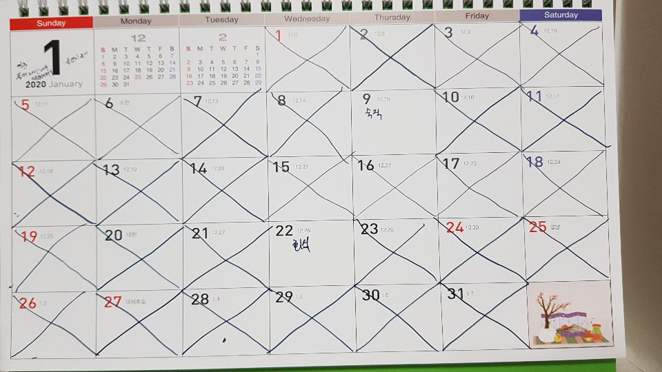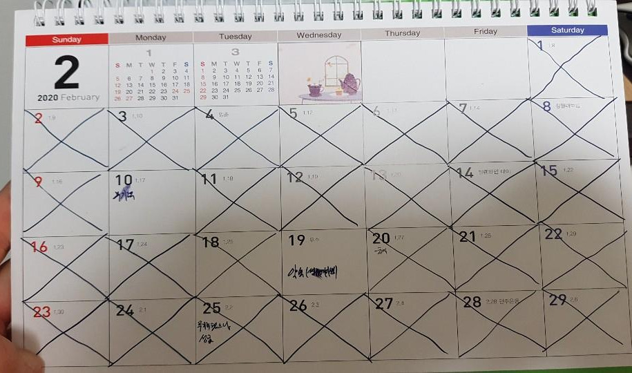 2020년 1월 1일부터 독서 2시간, 팔 굽혀 펴기와 스쿼트 50회 이상, 글쓰기를 매일 하려고 목표를 세웠습니다. 3가지 목표를 달성하면 달력에 'X'표시를 하였죠. 1월과 2월에 총 4일을 빼먹었지만, 이틀 이상 실패하지 않으려고 노력했습니다.