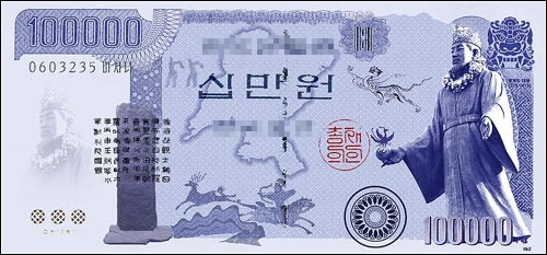 2004년에는 DC인사이드의 한 네티즌이 광개토대왕을 모델로 한 10만 원 화폐를 합성했을 때 광개토대왕릉비가 들어가 있었습니다. (출처 : 오마이뉴스)