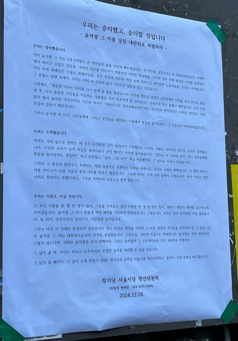 정의당 서울시당 청년위원회는 「우리는 승리했고, 승리할 것입니다 – 윤석열 그 자를 당장 내란죄로 처벌하라」의 제목으로 대자보를 게재했다. 이는 12월 3일 윤석열 대통령의 계엄령으로 인해 받은 충격을 언급하며 그럼에도 불구하고 계속해서 민주주의를 위해 싸우겠다는 강한 의지를 표명했다. 또한 윤석열 대통령의 이러한 계엄령은 국민을 겁박한 것이며, 대통령의 자격을 상실하게 한 사건이므로 윤석열 대통령의 탄핵에 앞장서겠다고 발표했다.