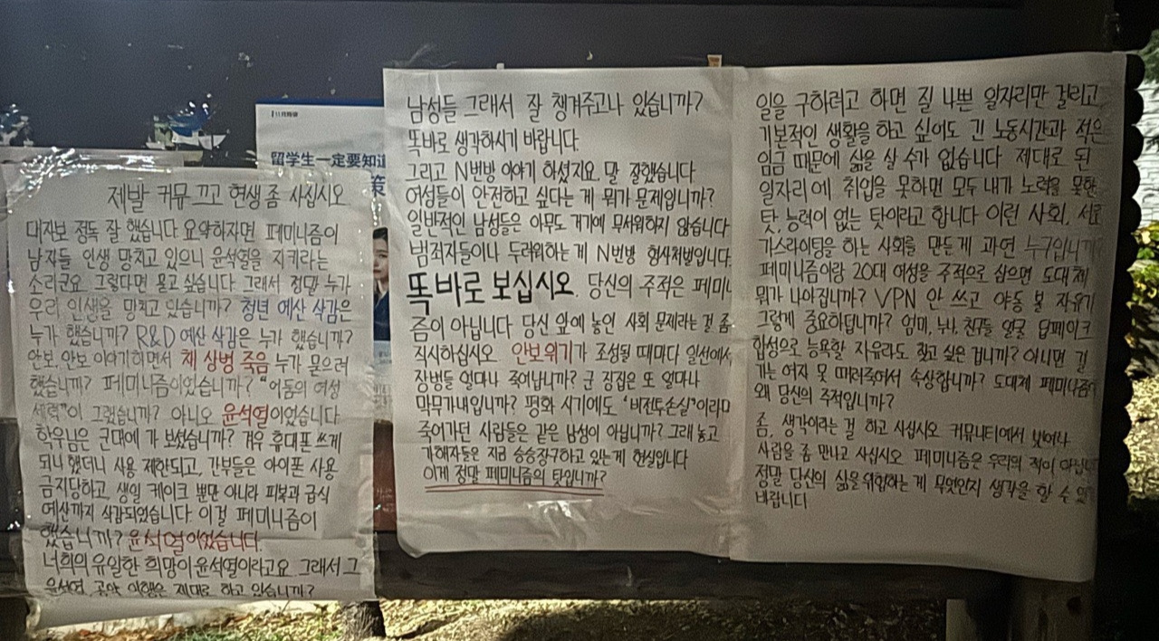 다향관 앞에 게시된 대자보다. 윤석열 정권이 자행한 청년‧R&D 예산 삭감, 채상병 사건 은폐, 군 지원 축소, 안보 위기라는 미명 하에 일어나는 군 착취와 더불어 노동 문제, 능력주의 사회 등 사회 병폐를 지적하는 대자보이다. 실질적 원인이 아닌 페미니즘과 20대 여성을 주적으로 두는, 우파 포퓰리즘에 놀아나는 커뮤니티와 이용자들의 행태를 비판하고 인식 재고를 촉구하고 있다.