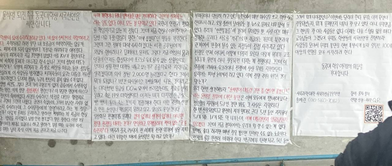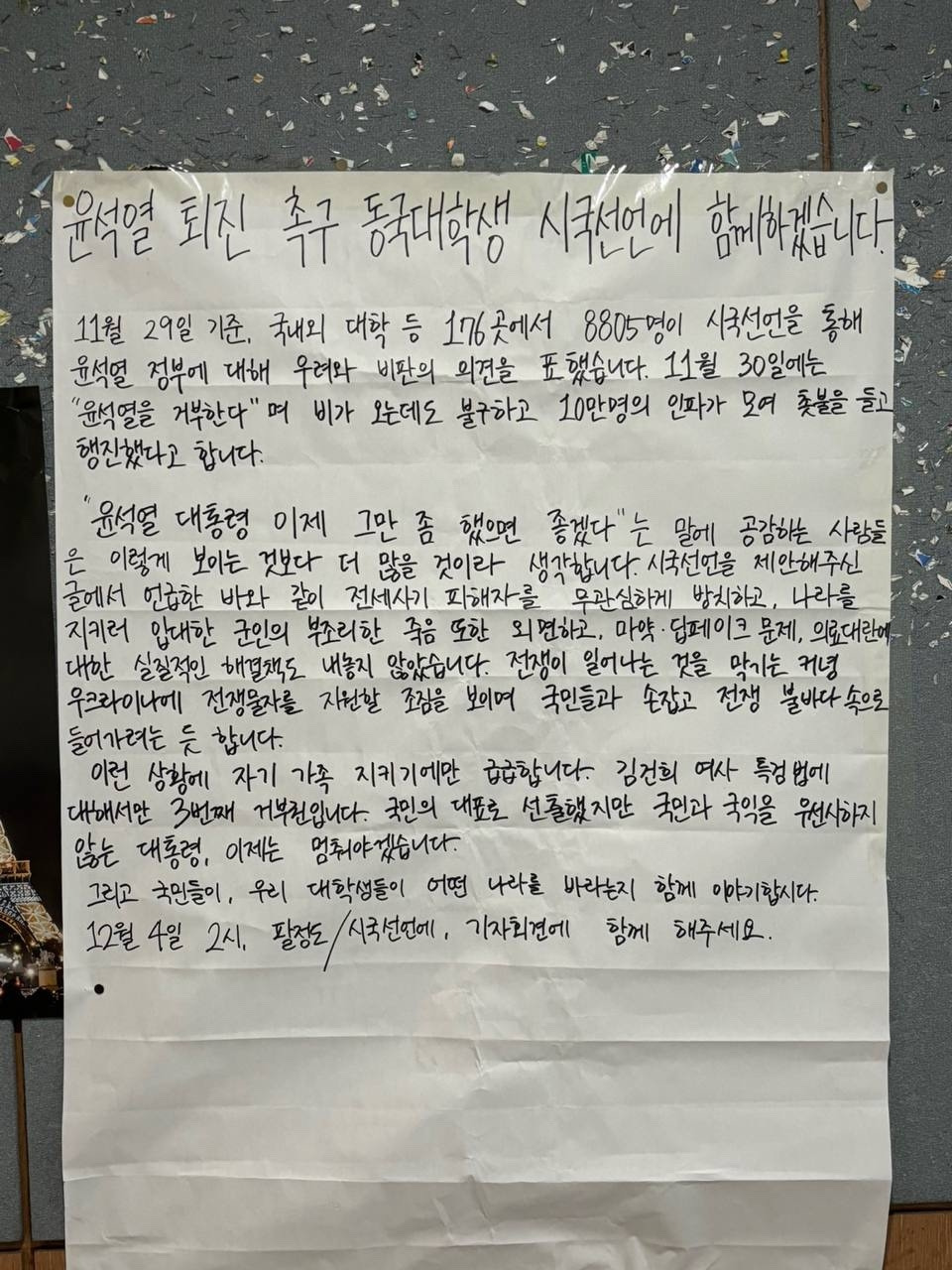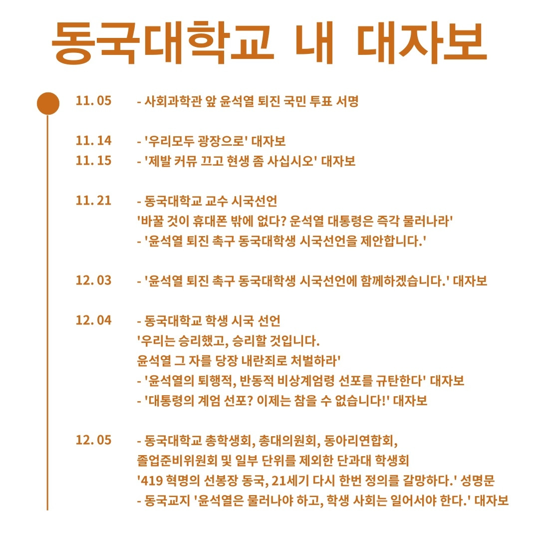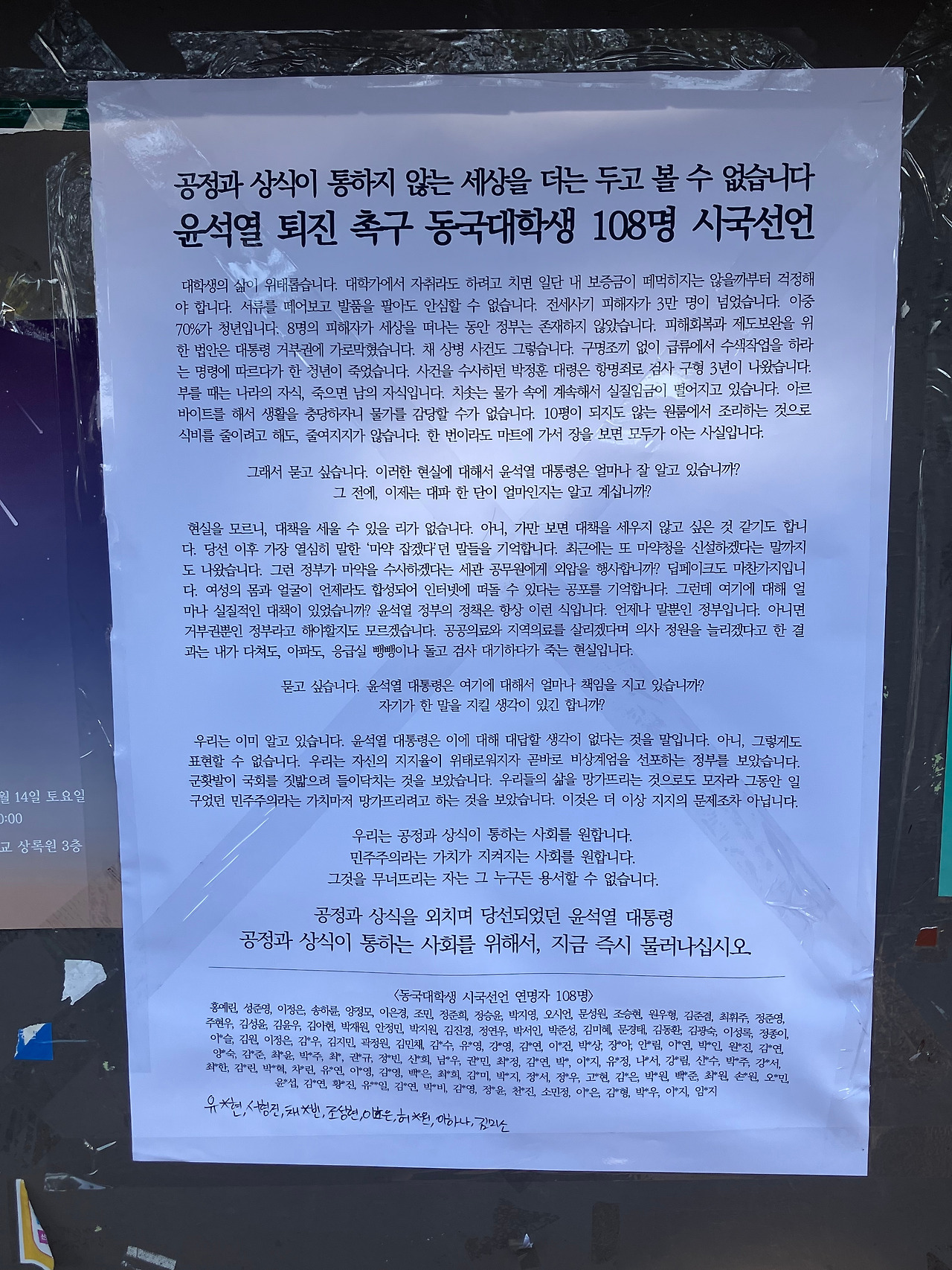 윤석열 대통령 탄핵을 위한 동국대학생 시국선언에 동참하겠다는 내용의 대자보가 게재됐다. 11월 29일 국내외 대학 176곳 총 8,805명의 시국선언과 11월 30일 10만 명의 촛불 행진을 언급하며 동국대학생 시국선언의 장소와 날짜를 명시하고 연대 의지를 표명했다.