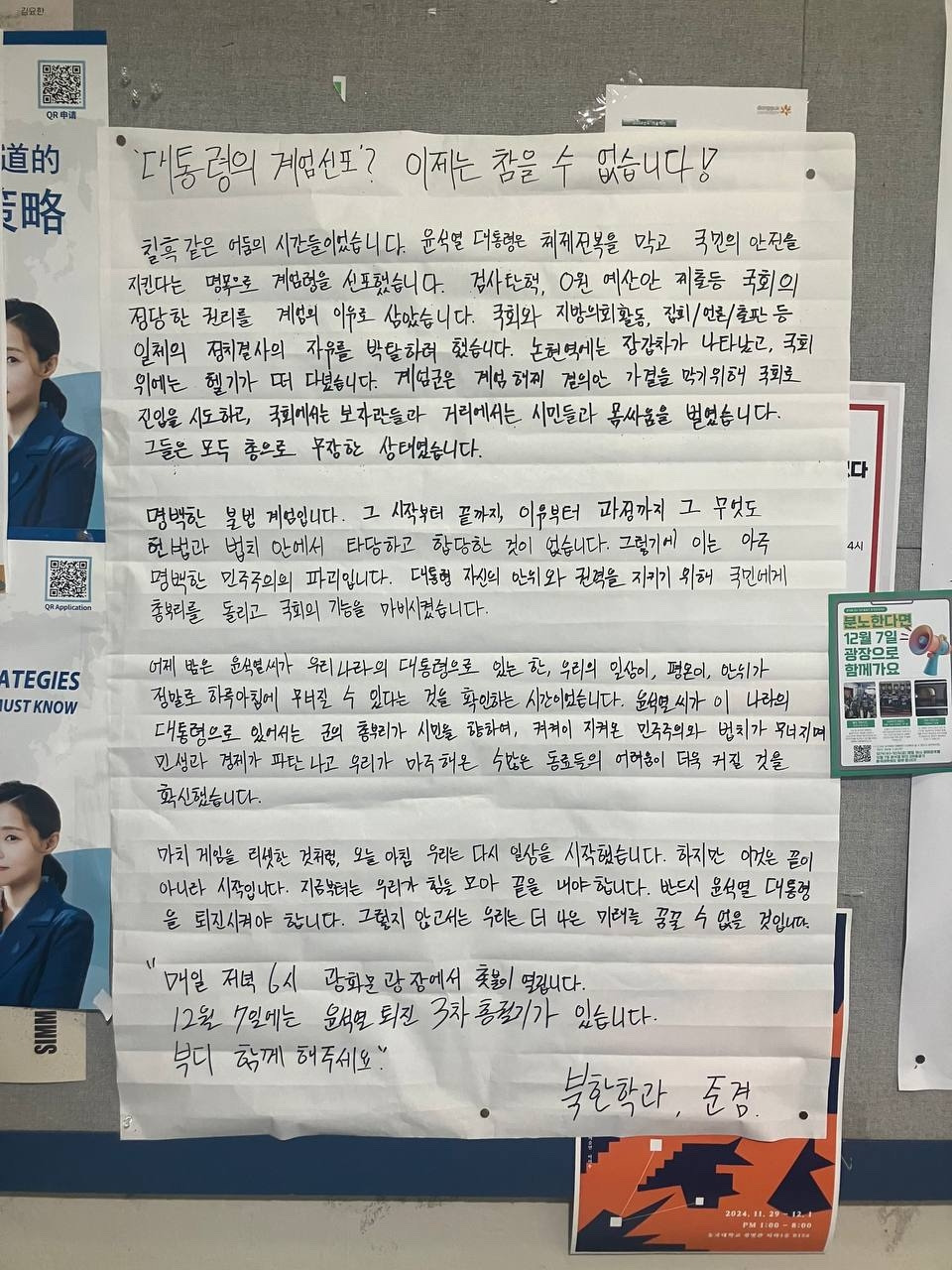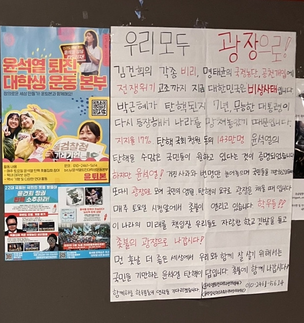 '윤석열퇴진대학생운동본부'(이하 '윤퇴본')에서 「우리 모두 광장으로!」라는 제목으로 대자보를 게재했다. 김건희의 비리, 명태균의 국정농단과 공천개입, 전쟁 위기 등을 언급하며 국가 비상사태를 선언했다. '윤퇴본'은 이 사태의 주범인 윤석열 대통령의 탄핵을 요구하며 대학생들의 연대를 요구한다.