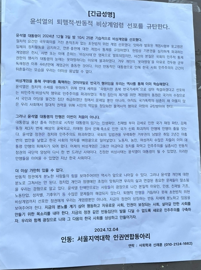 서울지역대학 인권연합동아리(이하 ‘인동’)은 「윤석열의 퇴행적, 반동적 비상계엄령 선포를 규탄한다.」라는 제목의 긴급 성명을 게재했다. 12월 3일 밤 윤석열 대통령이 선포한 비상계엄령이 쿠데타와 같은 반국가 행위라는 점, 윤석열 대통령의 만행이 이번이 처음이 아니라는 점을 언급하고 있다. '인동'은 이를 바탕으로 새로운 민주주의를 구축하기 위해 동국대학교 및 서울 지역 대학생들에게 연대를 요구하고 있다.