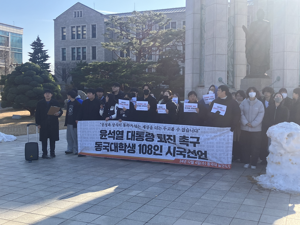계엄령 해제 당일 오후 2시, 동국대학교 팔정도에서 122명의 ‘동국대학생 시국선언 기자회견’이 진행되었다. 국어교육과 최휘주 학우의 인사를 시작으로 동국대학생 시국선언의 제안자인 사회학과 홍예린 학우의 개최 의도 발언이 이어졌다. 홍 학우는 선언을 준비하는 일주일 동안 응원을 건네준 동국대학생들에게 감사인사를 건네고, 전날 발생한 계엄령 선포에 "민주주의가 눈앞에서 무너"졌다며 강력하게 비판했다. 이후 사회학전공 12인 연대학생 중 대표로 문성원, 원우형, 허정원 학우와 북한학전공 김준겸 학우가 발언을 진행했고, 홍예린 학우의 시국선언문 낭독과 더불어 "21세기에 계엄령 선포가 웬 말이냐", "대학생이 민주주의 지켜내자", "비상식적 대통령을 규탄한다"라는 구호를 외쳤다.