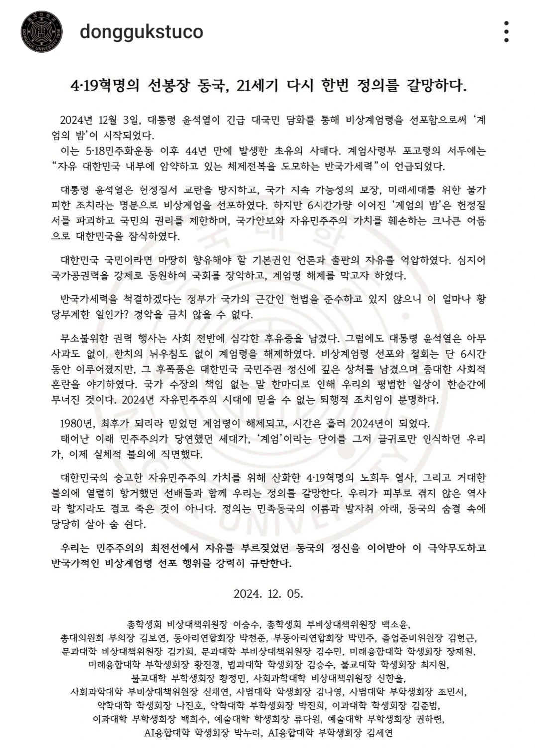 총학생회, 총대의원회, 동아리연합회, 졸업준비위원회 및 단과대 학생회(문과대학, 미래융합대학, 법과대학, 불교대학, 사회과학대학, 사범대학, 약학대학, 이과대학, 예술대학, AI융합대학)는 5일 오전 총학생회 비상대책위원회 인스타그램을 통해 윤석열 대통령의 비상계엄령을 규탄하는 성명문 「4.19 혁명의 선봉장 동국, 21세기 다시 한번 정의를 갈망하다」 를 발표했다. 윤석열 대통령의 비상계엄은 반국가세력을 척결하겠다는 목적으로 행해졌으나, 이는 헌법을 준수하지 않은 행위라며 경악를 금치 못한다고 언급했다. 이는 국가 수장으로서 책임없는 행동이자, 2024년 자유민주주의 시대에 퇴행적 조치라고 주장했다. 이에 더해 4•19혁명에서 민주주의를 위해 싸운 우리 동국대학교 선배들을 언급하며, 민주주의 최전선에서 자유를 부르짖었던 동국의 정신을 이어받아 극악무도하고 반국가적인 비상계엄령 선포 행위를 강력히 규탄했다.