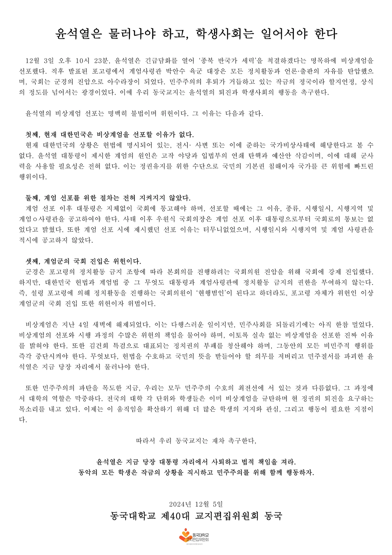 우리 동국대학교 교지편집위원회 동국(이하 ‘동국교지’)은 윤석열의 퇴진을 촉구하는 대자보를 게재했다. 동국교지의 대자보, 「윤석열은 물러나야 하고, 학생사회는 일어서야 한다」 는 12월 3일 선포된 비상계엄이 명백한 불법이고 위헌임을 비판하며, 윤석열의 퇴진과 법적 책임을 요구함과 더불어 동악 학생 사회의 행동을 촉구한다.