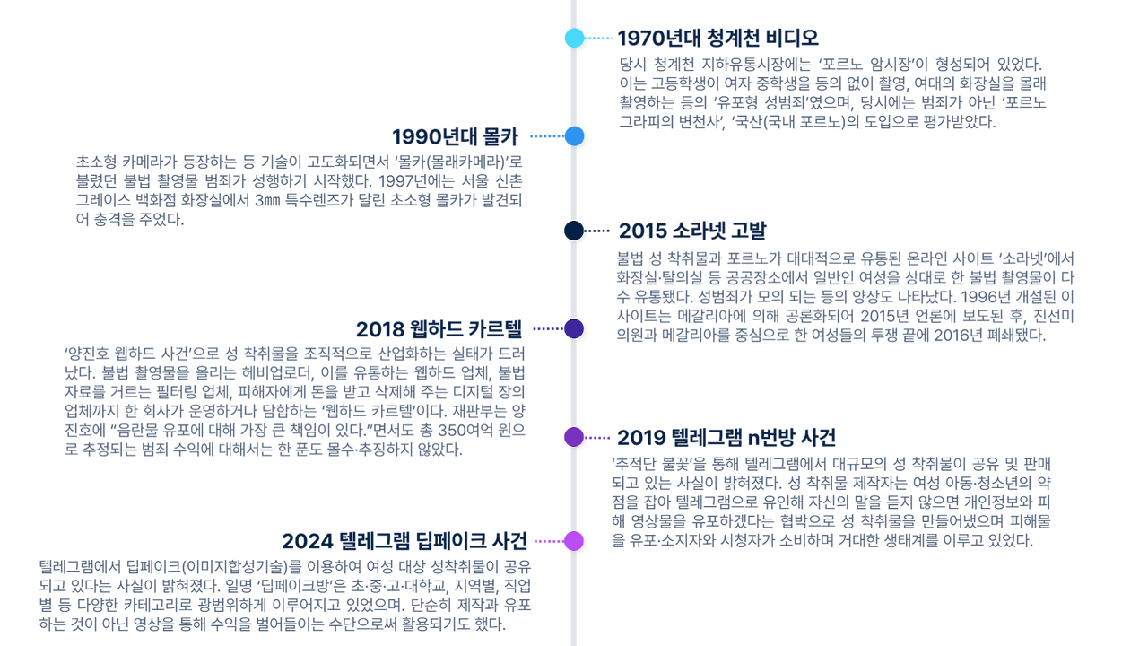 2024년 8월, 딥페이크(불법 합성물) 성범죄가 공론화되었다. 텔레그램 대화방을 통해 여성 대상 불법 합성 성범죄물을 제작해 유포해 왔고, 이러한 범죄가 전국적인 범위로 일어났다는 것이 밝혀졌다. 이와 같은 범죄 유형은 명백한 여성 대상의 성범죄이며 결코 한순간에 발생한 사건이 아니다. 1970년대에는 서울 청계천 등에서 ‘포르노 비디오’를 유통하는 암시장이 형성되어 있었고, 1990년대에는 여성 연예인뿐 아니라 일반인 여성을 불법으로 촬영한 비디오가 유통되었다. 촬영기기가 발달하며 등장한 ‘몰카(몰래카메라)’까지. 여성 대상 성범죄는 기술의 발전 양상에 발맞춰 다양한 방식으로 변주되어 왔다. 이는 점차 오프라인을 넘어서 온라인까지 확산하었다. 세기가 바뀌어도 세상은 여전했다, 2015년에는 ‘소라넷’이 언론에 보도되었다. 1 년 뒤 사이트는 폐쇄되었지만, 추징금 0원, 처벌받은 범죄자는 운영자 3명 중 단 1명, 그리고 100만 명의 회원들에게는 처벌은커녕 아무 일도 일어나지 않았다. 2018년에는 ‘웹하드 카르텔’이 공론화되었다. 2019년에는 사회관계망서비스(SNS)를 이용한 ‘텔레그램 n번방 사건’이 발생했다. 이 역시 일부 핵심 주동자를 제외한, 성 착취물을 텔레그램 대화방에서 다운로드하거나 구입한 혐의의 ‘일반가담자’ 277명 중 205명(74%)에게는 평균 13.2개월 징역형의 집행유예가 선고되었다. 시대와 기술의 변화에 맞춰 가해자들은 플랫폼과 플랫폼을 건너다니며 범죄를 이어가는 데 능해지고 있다.