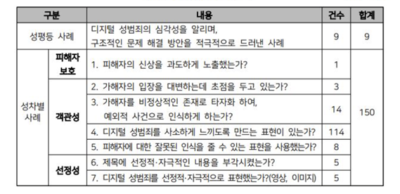 그러나 이후의 사건 보도를 살펴보면 이런 윤리 강령이 지켜지지 않고 있음을 확인할 수 있다. 2019년 ‘N번방 사건’ 당시 언론은 가해자 조주빈과 문형욱의 성장 배경과 가정환경을 자세히 보도하며 그들에게 불필요한 서사를 부여했고, ‘악마’라는 표현을 사용하여 N번방 사태가 구조적인 성폭력이 아닌 개인의 문제라고 치부해버렸다. 또한 서울YWCA가 'N번방' 검색어 임의 표본(랜덤 샘플링)을 통해 2020년 1월 1일부터 4월 26일까지 네이버 포털 뉴스에 등록된 25,259개의 기사 중, 총 982개 기사를 모니터링한 결과, 텔레그램 성착취 사건을 보도한 총 982건의 기사 중 성차별적인 보도 사례가 150건(15.3%, 중복허용) 발견되었다.² 해당 기사들은 성착취 범죄물을 ‘음란물’, ‘몰카’ 등의 표현을 사용해 사소한 ‘야한 동영상’으로 치부하고 있었다. 성착취물은 그저 남성들의 욕구를 해소하기 위해 제작되는 ‘음란 동영상’이 아니다. 남초 커뮤니티와 사회적 구조 내에서 여성을 착취하고, 이에 기반한 젠더 불평등을 심화하기 위한 수단이다. 안타깝게도 언론사들은 현재도 이렇게 성차별적인 구조를 강화하는 보도 행태를 지속하고 있으며, 남초커뮤의 억지 논리가 전파되는 데에도 기여하고 있다.