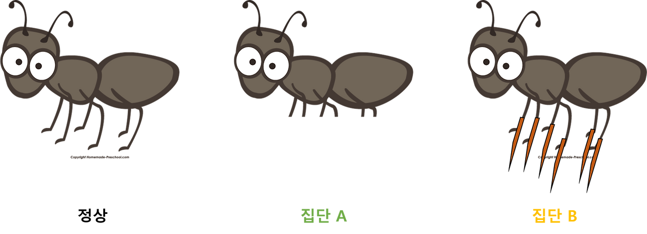 다리에 돼지 털을 이어 붙여 길게 해 준 '집단 B'를 형성하였다.