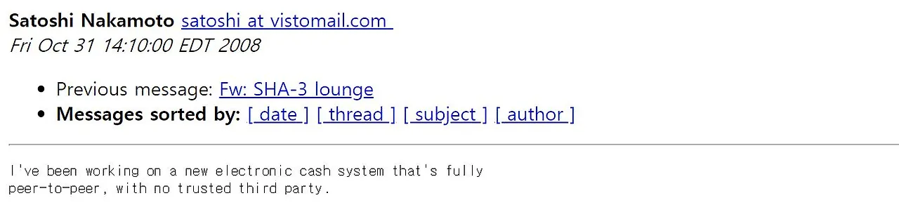 2008년 10월 31일, Satoshi Nakamoto라는 닉네임의 유저가 다음과 같은 글을 남겼다.