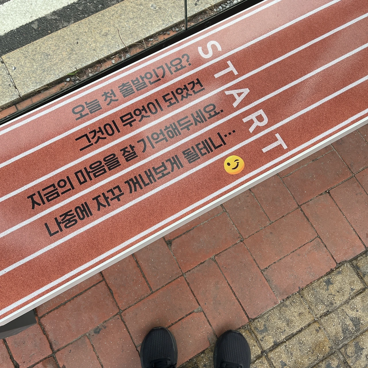 토요일 이른 아침. 바다의 날 마라톤을 뛰러 가는 길, 빗방울이 살짝씩 떨어진다. 오늘은 우중런인가 싶어 멍하니 앉았다가 갈아타야 할 역을 지나쳤다. 제시간 도착은 이미 틀린 듯하고, 자포자기한 마음으로 버스를 기다리는데 눈앞에 보이는 정류장 의자 위 문구가 나를 멈추게 한다. ‘오늘 첫 출발인가요? 그것이 무엇이 되었건 지금의 마음을 잘 기억해 두세요. 나중에 자꾸 꺼내보게 될 테니…’ 마라톤 가는 날, 버스 정류장 의자마저 러닝 트랙이라니. 기막힌 우연이다. 이걸 보려고 돌아가는가 싶을 정도로.