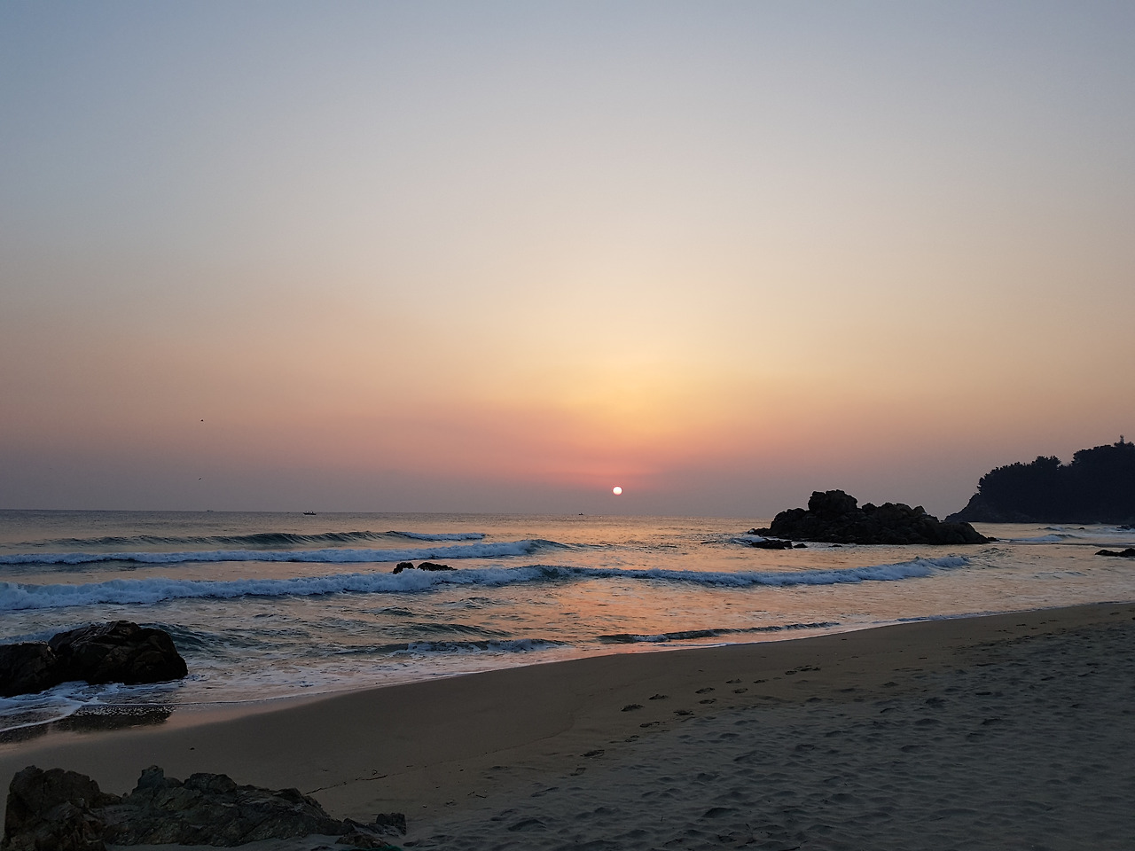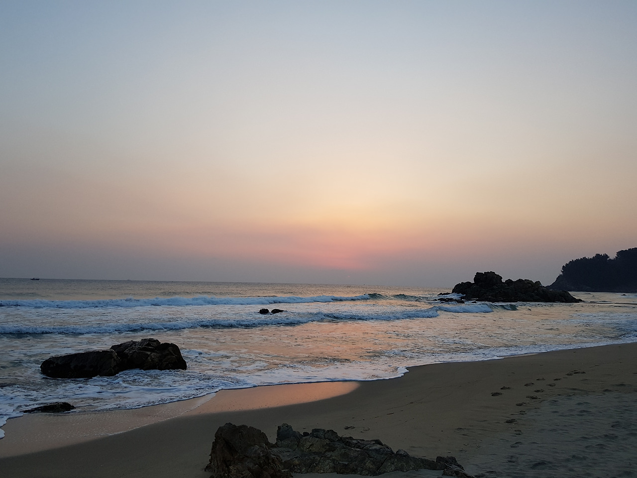 7시 21분. 해가 보이지 않는다. 바닷바람을 맞으며 동쪽 하늘을 열심히 바라보고 있는데, 동쪽 하늘이 붉게 보일 뿐 해는 보이지 않았다. 오늘의 일출 시간을 인터넷으로 확인해보니 해 뜨는 시간이 7시 24분이었다. "그래서 해가 보이지 않았구나" 생각하며, 또 기다렸다. 7시 25분이 되었는데도 해가 보이지 않는다. 순간, “아! 해가 떴는데 구름에 가려서 보이지 않는구나?” 하는 생각이 들었다. 이미 동쪽 하늘은 붉은색을 띠고 있었고, 그것은 이미 해가 뜨고 있다는 것을 의미하는 것이었다. 잠시 후 동쪽 하늘이 점점 더 붉게 보이기 시작했다. 그리고 한 순간 갑자기 붉은 점이 바다에서 구름 사이로 올라오기 시작하더니 그 붉은 점이 점점 더 강한 노란색으로 바뀌기 시작했다. 선명한 빛의 해가 떠 올라왔다. 그 순간 마음에 그런 생각이 떠 올랐다. "그래! 오늘도 해는 떠오르는구나…"