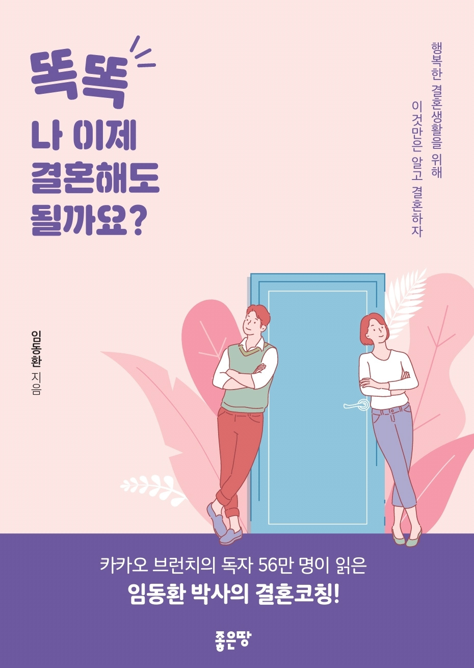 카카오 브런치에 작년부터 매주 한편씩 결혼에 대하여 쓴 원고가 9월 말이면 책이 되어 나옵니다. 그동안 카카오 브런치의 56만 명의 독자가 읽었습니다. 결혼 전의 청년들, 결혼생활을 하고 있는 부부들이 적어도 이런 것은 알고 결혼생활을 해야겠다는 생각을 가지고 원고를 썼습니다. 브런치 북에서는 "똑똑. 나 이제 결혼해도 되나요"로 했으나 출간 책명은 조금 바뀌어서 "똑똑. 나 이제 결혼해도 될까요?"로 출간됩니다. 이 책을 통해 많은 가정들이 더욱 행복해졌으면 좋겠습니다. 책이 나오면 읽어보시고 주변에 계신 분들에게도 권해주세요. 감사합니다. 임동환 드림.