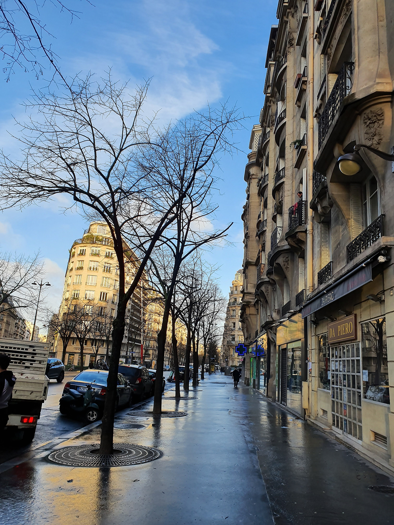 비 온 다음날 새벽의 파리의 거리. 하늘의 푸른빛이 바닥에 반사가 된다. 새벽에 한 컷을 찍었다.