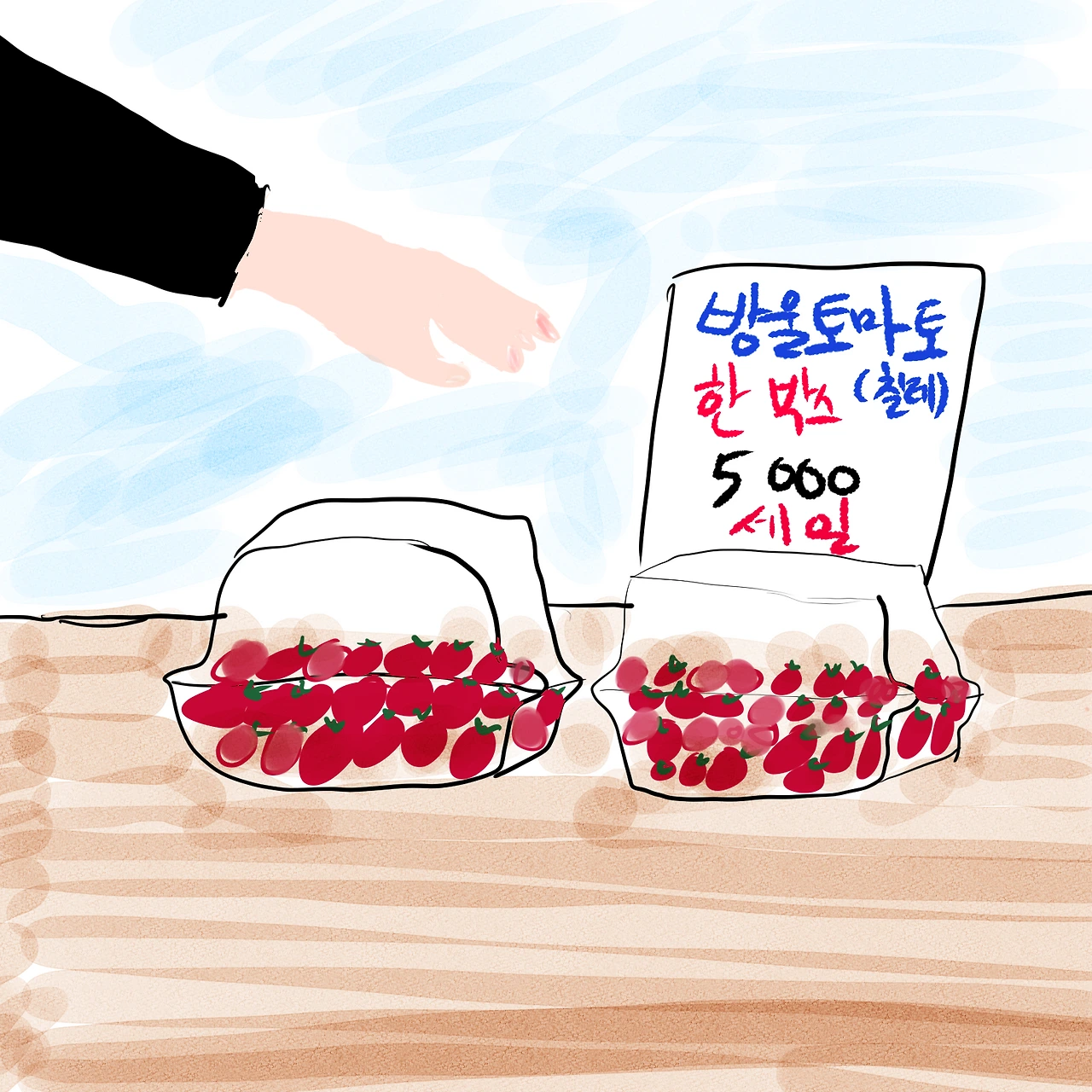 방울토마토가 오천원에 마늘이 칠천원이다. 그런데 왜 만 오천원일까. 바가지를 씌우려는 것을 알았지만 비굴한 나약함 때문에 뭐라 말 한 마디 못해보고 그대로 만 오천원을 주고 왔다.
