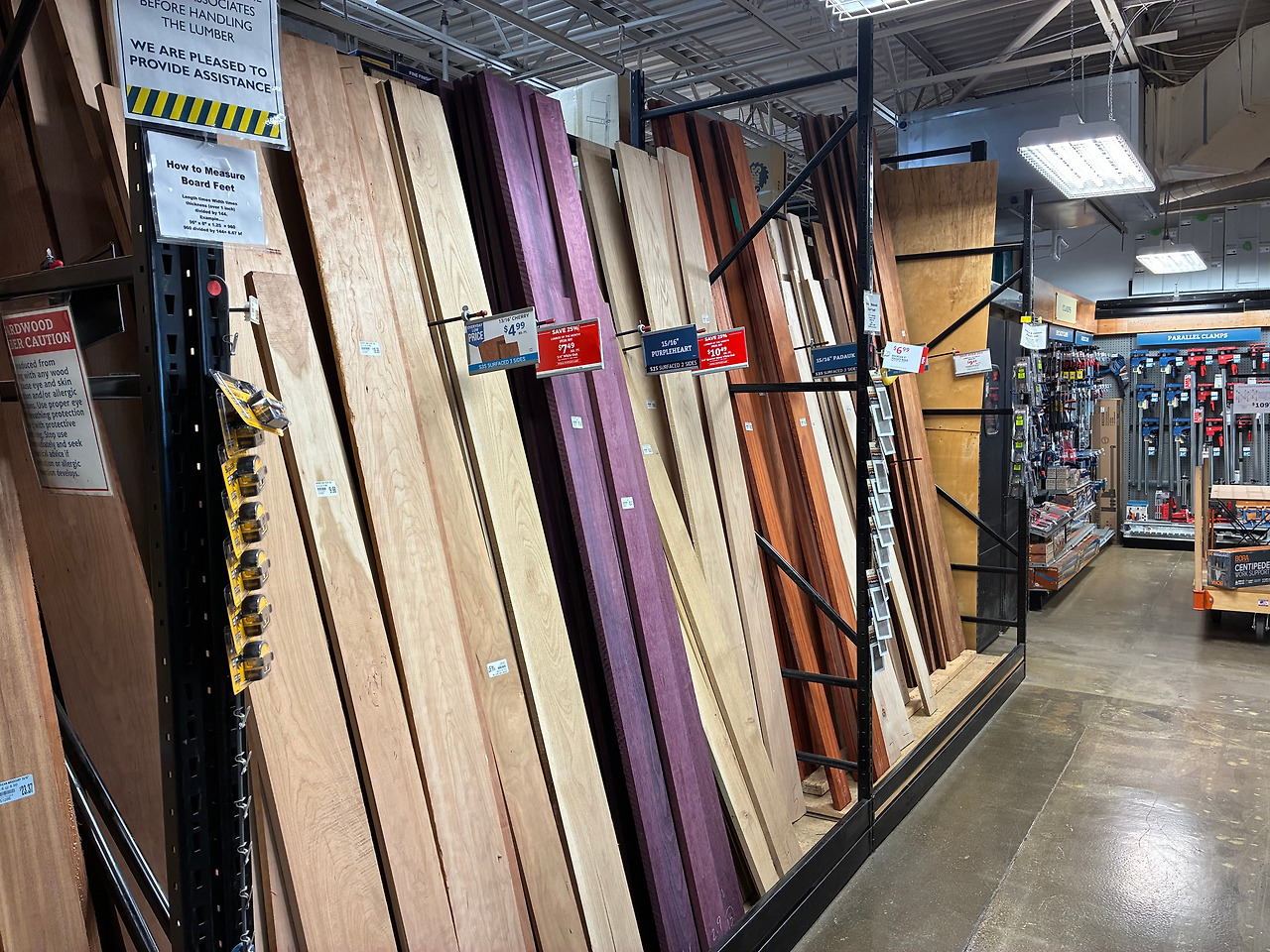 목재도 다양한 종류의 제재목과 규격목재를 판매한다. 한 군데에서 다양한 종류와 규격의 목재를 볼 수 있다는 것은 큰 장점이다. 가구 소품 수준의 취미 목공에서 여러 목재를 마련하기 위해 발품을 팔지 않아도 된다는 부분은 중요하다. 메이플, 체리, 월넛, 오크 등 북미산 목재의 경우는 국내보다 가격이 좋지만 수입산 하드우드의 경우는 별반 차이가 크지 않다. 절단 등의 서비스를 제공하기도 하는데, 인건비가 비싼 나라인 것을 감안해야 한다. 이런 목공전문 매장이 아닌 제재소 (Sawmill) 나 목재상 (Lumber yard)의 경우에는 더 큰 목재들을 보고 골라 살수 있지만 재(材, Board foot, 흔히 '사이'라고 하는 단위) 당으로 가격을 매겨 크게 판매하므로, 집에서 꽤 큰 규모의 켜기, 자르기 가공이 가능해야 한다.