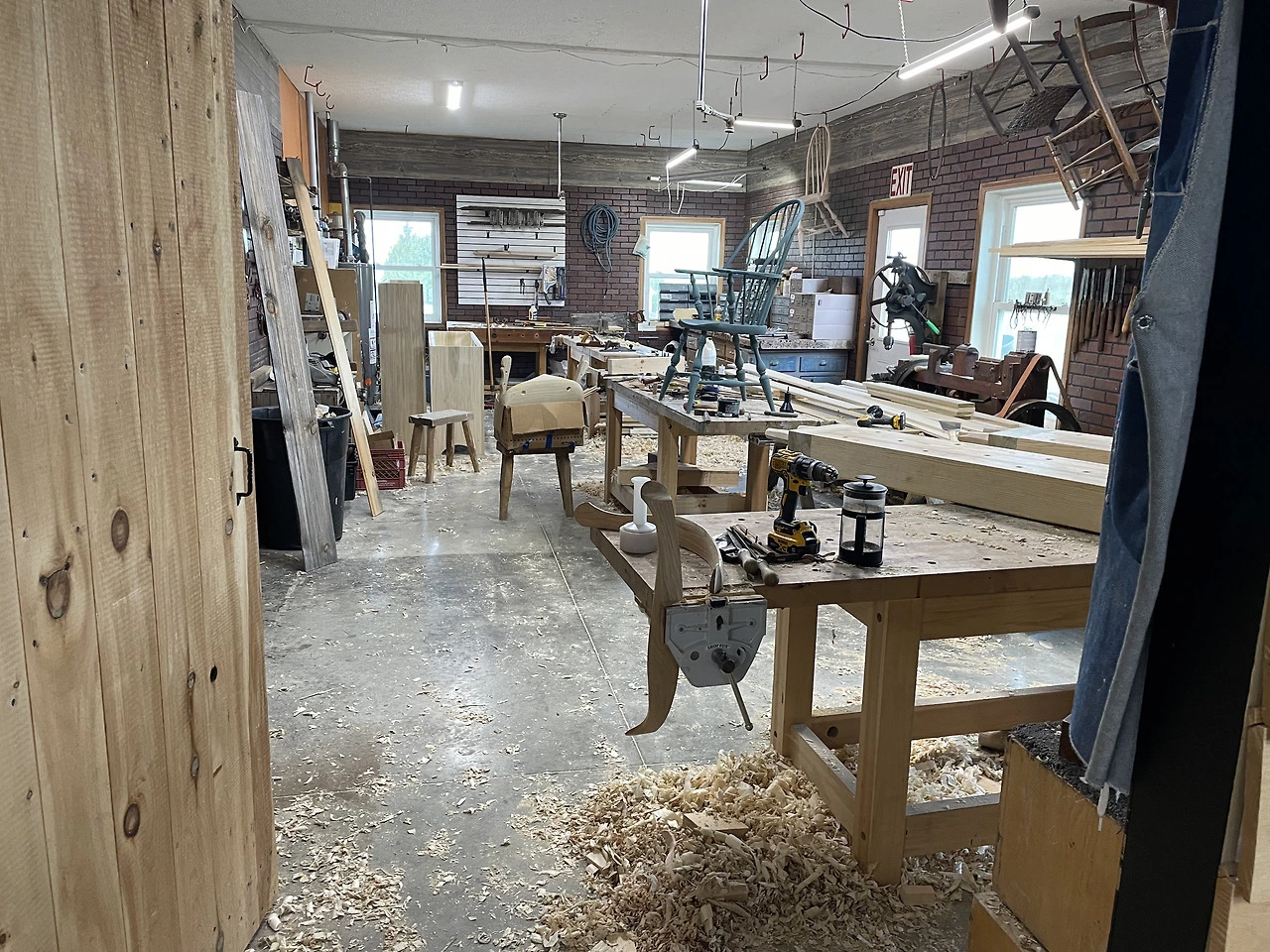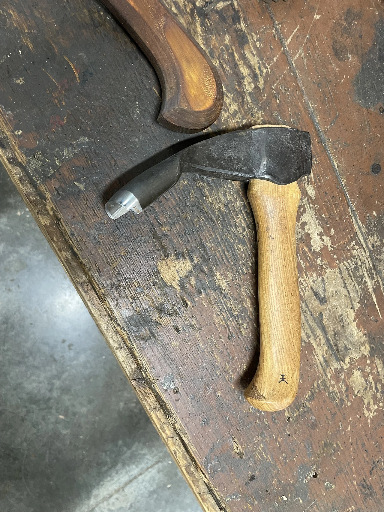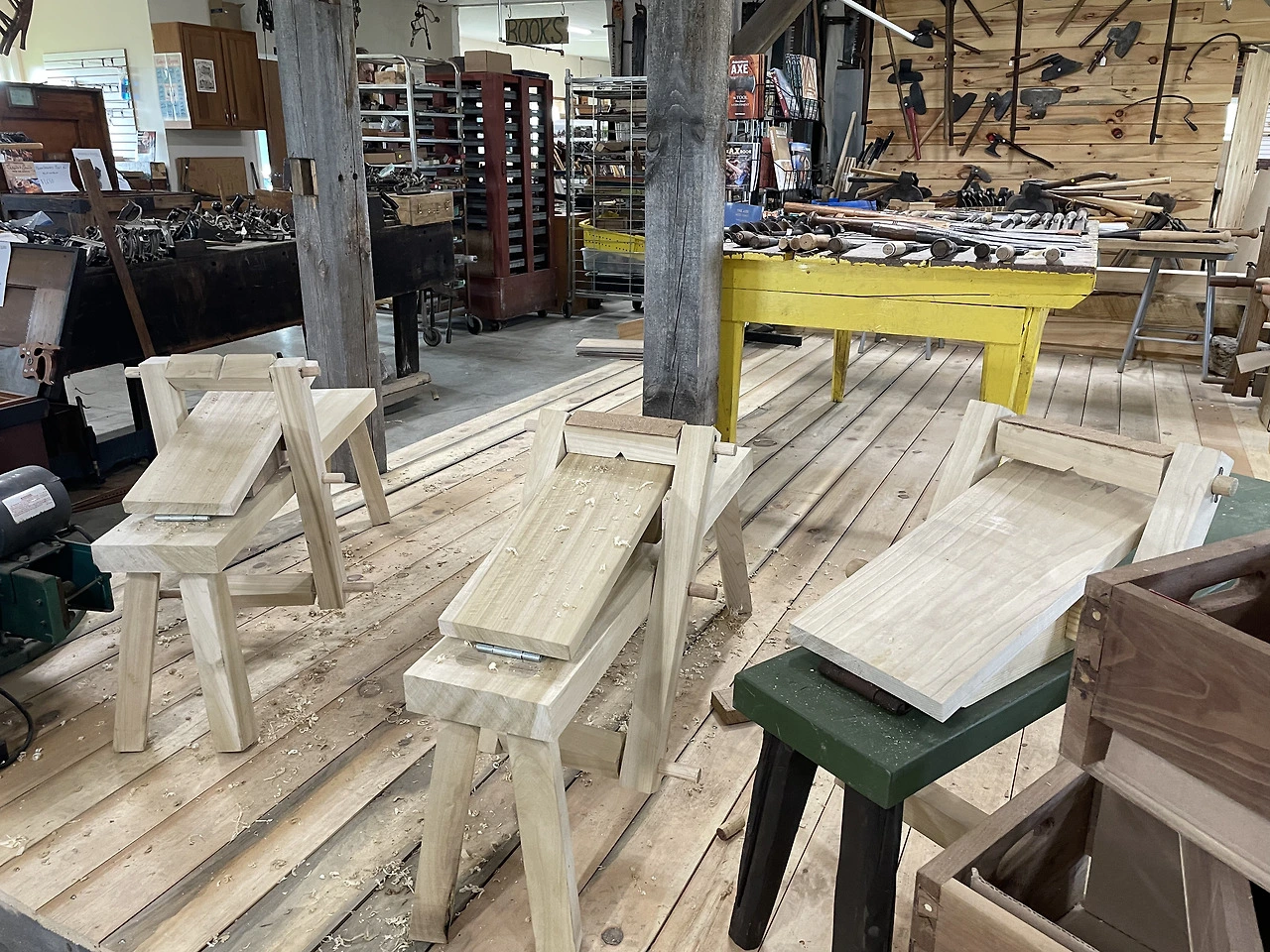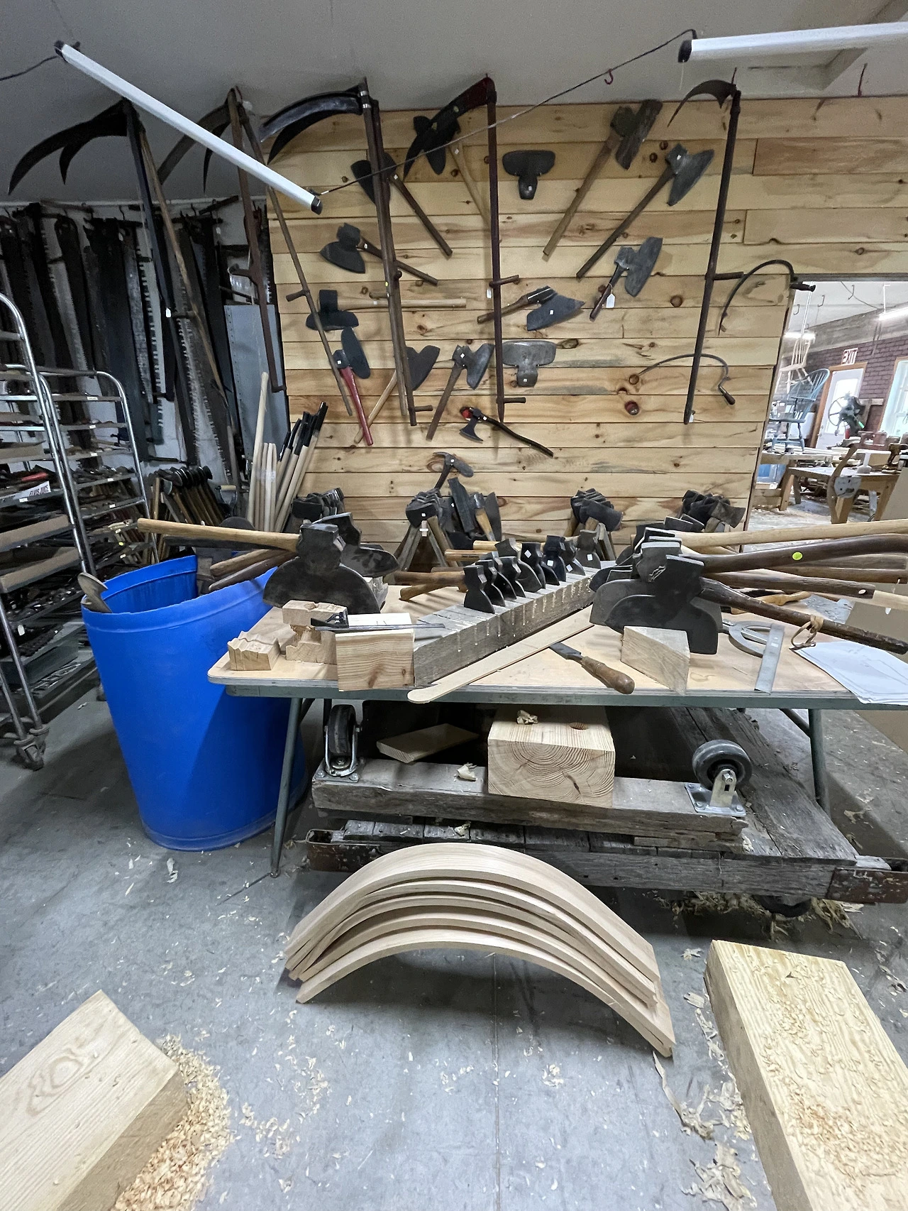 안쪽의 공방에서는 선이 우아한 윈저 체어를 만들고 있다. 전기를 쓰지 않는다고 들었는데, 다리는 수동 선반으로 깎은 것일까 궁금하다. 전등이며 커피 기계를 쓰는 것을 보아 전기를 전혀 쓰지 않는 것은 아닌가보다. 공방 한쪽에는 직접 만든 듯한 훑이기 작업대 (Shave horse) 새 물건들이 있다. 톱 몇자루를 골라 잘라보고 있는데, 슬그머니 다가와 최근에 어렵게 구했다며 스웨덴에서 온 자귀 (Adze)를 한자루 보여준다. 자귀는 물건이 잘 없고, 지금 있는 것은 직접 쓰는 것들이라 팔지 않는단다. 아마도 의자의 좌판을 깎는데 쓸 텐데, Shave horse 도 그렇고 근래 의자 만들기에 꽂혀 있는 것이 확실하다.