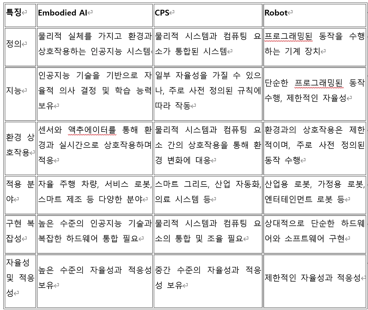 Embodied AI, CPS, 로봇은 기술 구현 방식과 적용 분야에서도 차이를 보입니다. Embodied AI는 인공지능 알고리즘과 로봇 하드웨어의 긴밀한 통합을 통해 구현되며, 주로 비정형화된 환경에서의 자율 작업에 활용됩니다[24]. CPS는 물리 시스템과 컴퓨팅 시스템의 실시간 연동과 데이터 분석에 중점을 두며, 스마트 팩토리, 스마트 그리드, 자율 주행 등의 분야에서 활용됩니다[25]. 로봇은 정해진 작업을 수행하기 위한 하드웨어 설계와 제어 소프트웨어 개발에 주력하며, 산업용 로봇, 서비스 로봇 등으로 분류됩니다[26].
