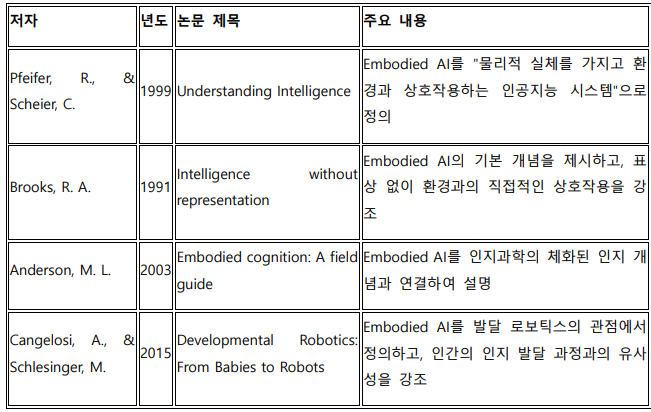 Embodied AI의 정의에 대한 학술적 논문의 뒷받침과 출처를 다음과 같이 표로 정리하였습니다: