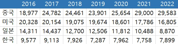 표 3 국가별 연간 특허 출원수[2]