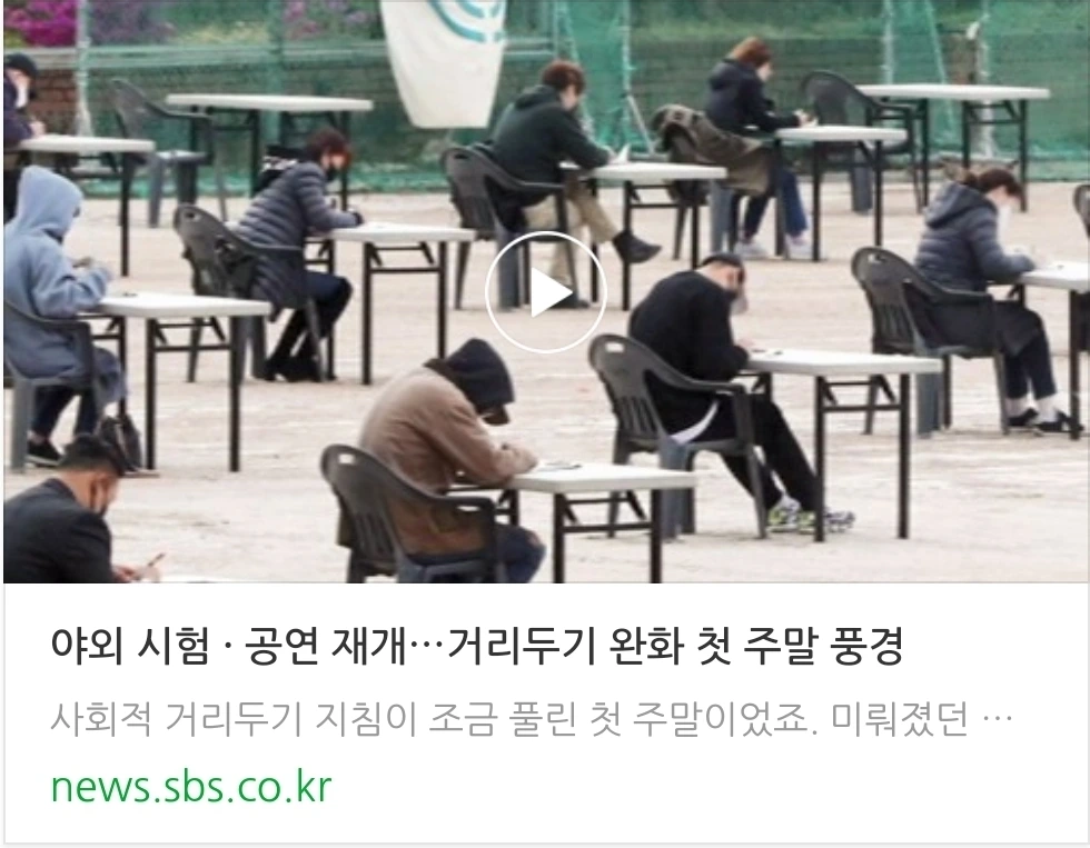 사회적 거리두기 지침이 조금 풀린 첫 주말이었죠. 미뤄졌던 시험도 치러졌고 공연장도 다시 열린 곳들이 있었습니다. 출처 : SBS 뉴스