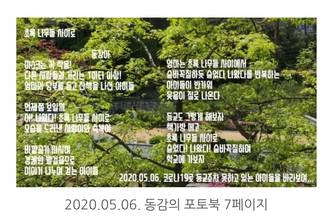 ‘저 초록 나무들 사이로 책가방을 메고 등교하는 아이들의 모습을 하루빨리 볼 수 있으면 얼마나 좋을까?’ 하루빨리 모든 아이들이 정상적으로 등교할 수 있기를 간절히 바라는 마음을 담아 그 순간을 글로 남기고 싶었다.