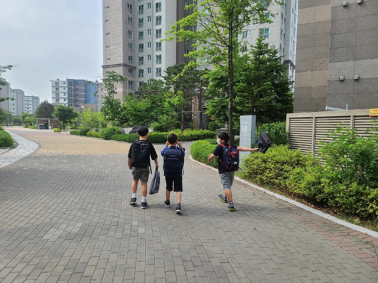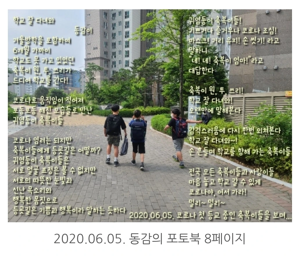 겨울방학부터 쭉- 지금까지 학교를 가지 못했던 축복이는 친구들과 함께 가벼운 발걸음으로 학교를 향해 걸어가고 있었다. 부모 입장에서는 코로나로 염려되는 부분도 많겠지만 아이들에게 등굣길은 역시 행복인 듯했다. 마치 초등학교 입학하던 그날처럼 아이들은 들떠있었고 아이들의 목소리만으로도 충분히 그 즐거움이 느껴졌다. 함께 학교 길을 걷는 축복이 원, 투, 쓰리는 서로 눈 맞춤하며 신이 나서 기분이 붕붕 떠가는 듯한 목소리로 대화가 끊이지 않았다.