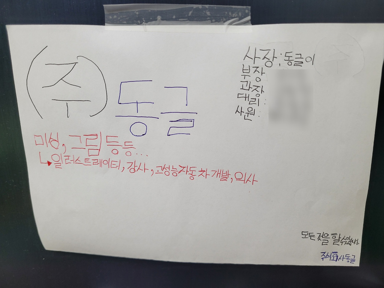 그 말을 들은 아이가 바로 실행에 옮긴다. (주)동글 간판을 만들어 노트북 앞에 딱 붙여주기까지. 각자의 꿈을 담은 우리만의 주식회사. “모든 것을 할 수 있습니다.” 어디서 보고 들은 것인지 몰라도 내게 잔뜩 힘을 주는 한 마디! 아이 덕에 오늘도 나는 꿈을 꾸며 재봉틀을 돌려본다.