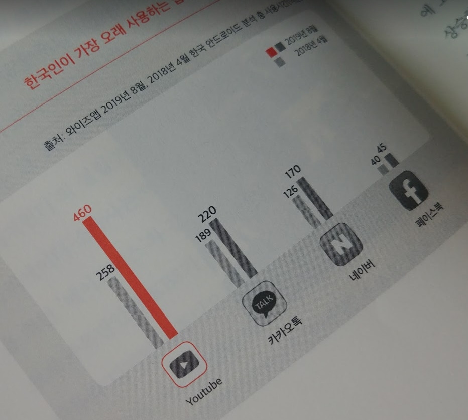 김범휴, 유튜브 마케팅의 정석, 더퀘스트, 2020, 12쪽 중에서 '한국인이 가장 오래 사용하는 앱'