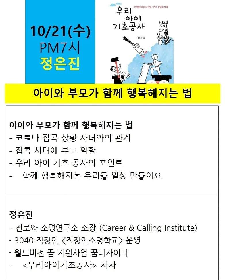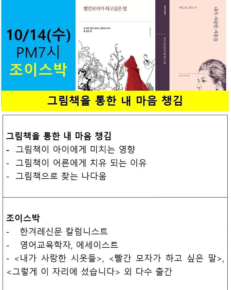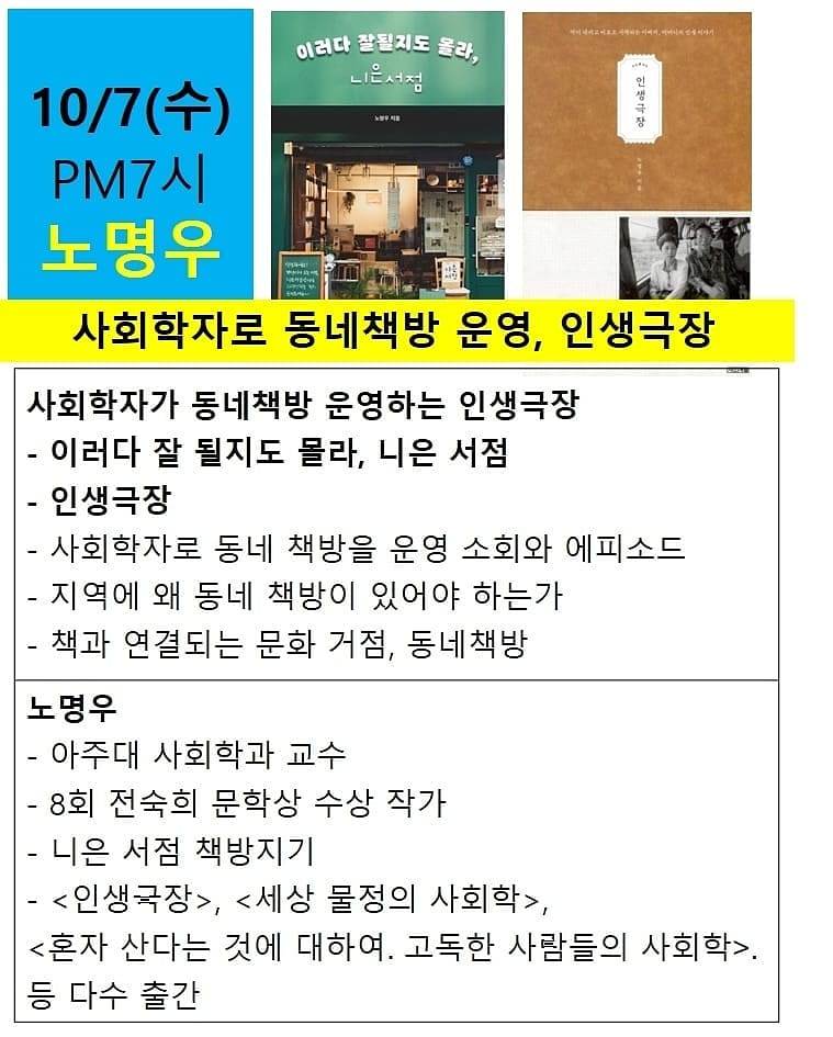 사회학자로 동네책방 니은 서점을 운영하는 노명우 교수님을 시작으로, 심장을 무찌르는 글쓰기로 유명한 Joyce Park조이스박, 온라인 북 토크 노하우를 이미 체득한 부모교육의 방향을 이야기하는 정은진, 뼛속까지 이과생인데 역사 인문학 글을 쓰면서 독서를 강조하는 안계환. 이런 라인업 드물지요. 이번 온라인 북토크 놓치면 본인 손해입니다.!!!!!