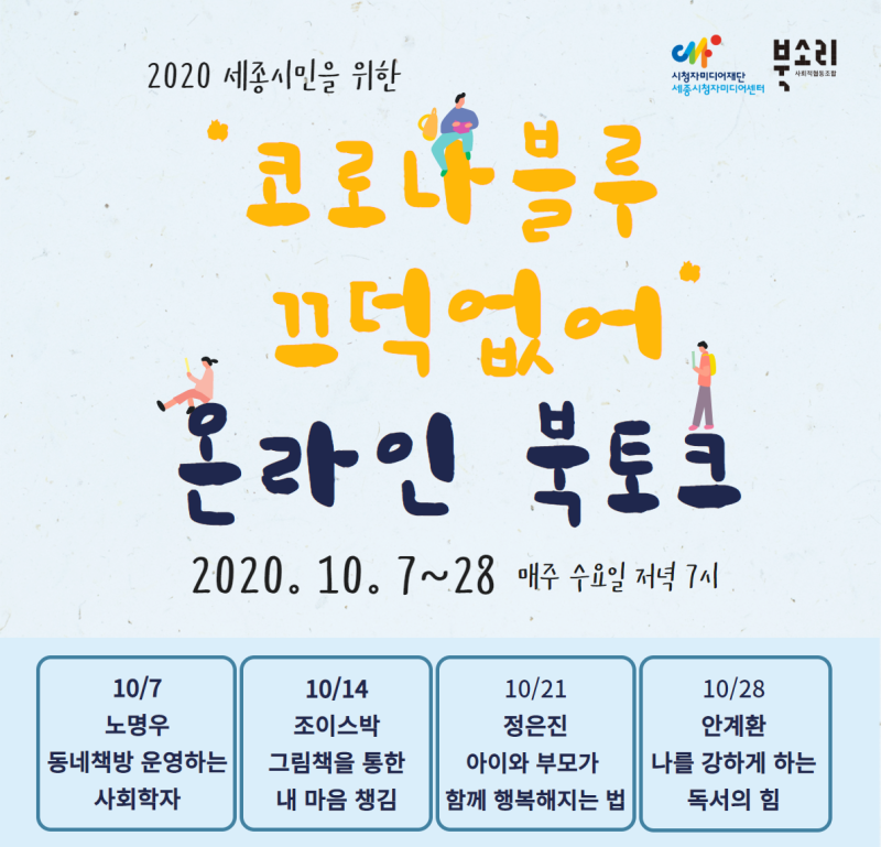 세종시청자미디어센터×북소리책방세종이 함께하는 '코로나블루 끄떡없어' 북토크 콘서트 안내입니다