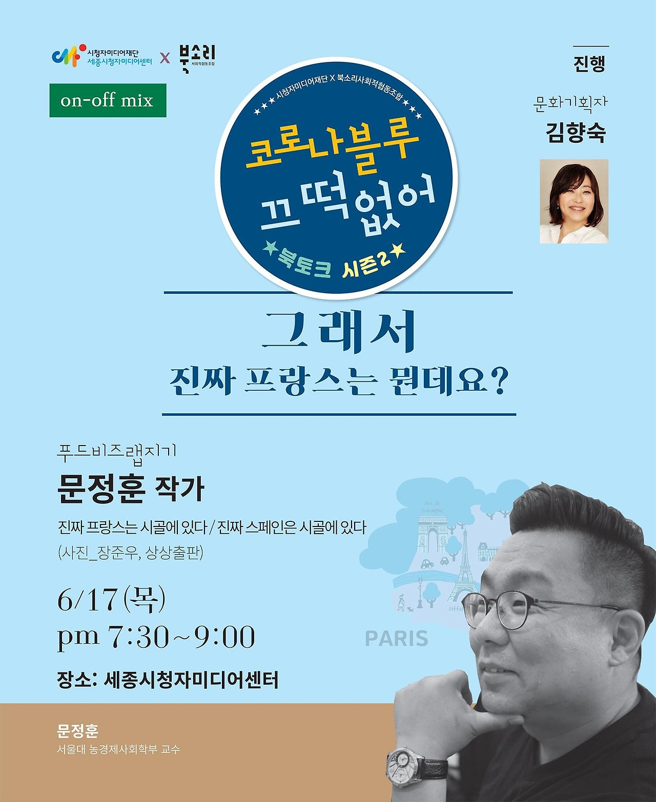6월17일 오후 7시30분은 온오프믹스로 세종시청자미디어센터에서 합니다. 문정훈 교수님의 글담에 푹 빠진 분들 많으시죠? 그 글담이 입담으로 연결되는지 저도 몹시 궁금합니다. 그래서 제가 진행을 봅니다. 프랑스와 스페인의 진짜는 시골에 있다고 목놓아 외치는 그 재미를 온에서, 오프에서 만나보는 자리입니다. 구글폼으로 광클릭 아시죠!!!!