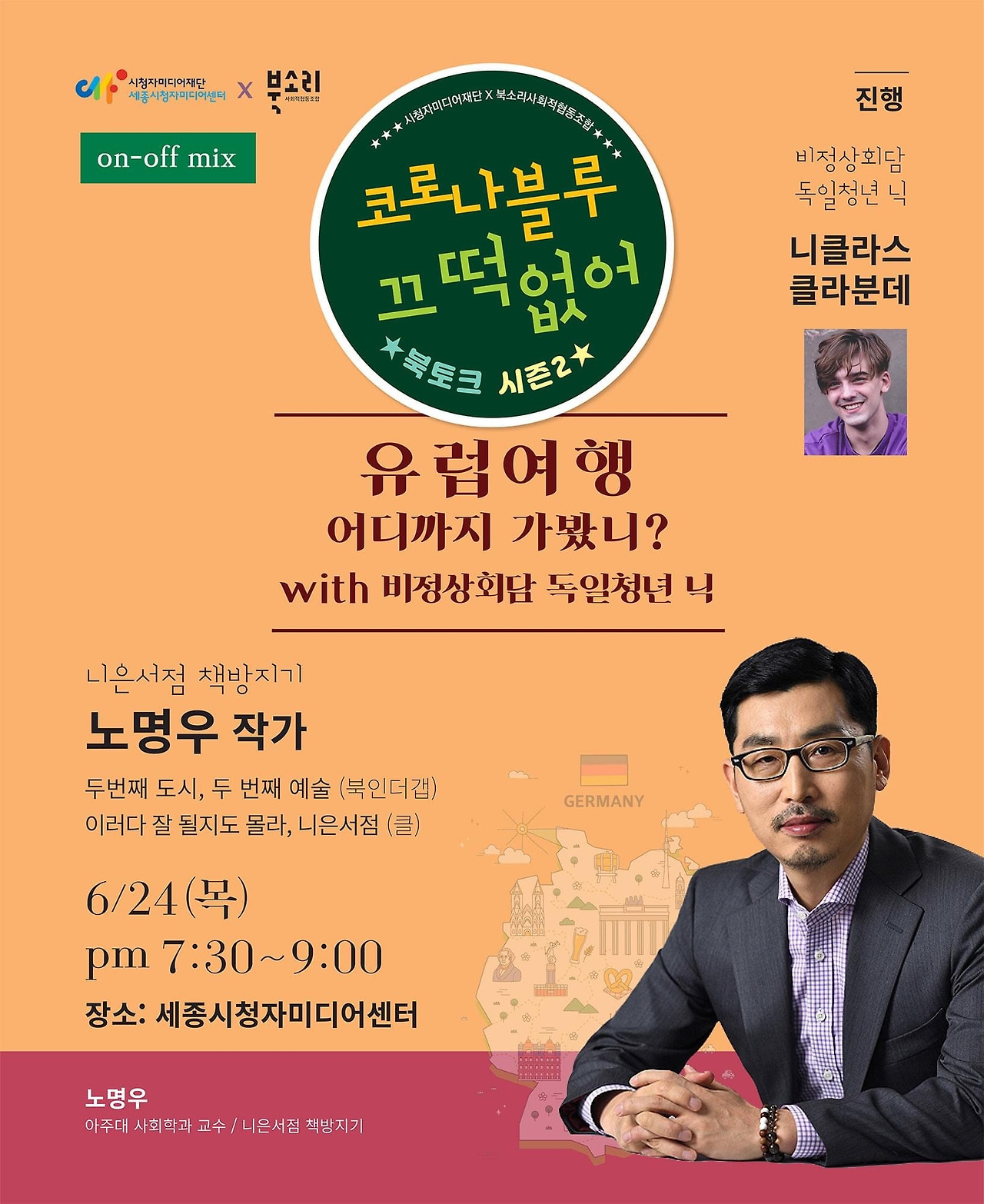 6월24일 오후 7시30분, 노명우 교수님입니다. 역시 온오프믹스로 세종시청자미디어센터에서 합니다. 작년 시즌1에서 첫 장식을 열었지요. 그 때 확인한 팬덤의 에너지를 또 기다립니다. 이번에는 특별히 비정상회담 시즌2에서 독일 청년으로 활동한 닉이 진행을 봅니다. 독일 유학을 다녀온 노명우 교수님의 청년과 한국에서 생활하고 있는 독일 청년의 그 판은 또 얼마나 흥미진진 할지 제가 다 설렘합니다. 그들이 기억하는 독일은, 유럽, 서울은 어떤 다름이 있을까요? 그거 궁금하시면 역시 광클릭으로 신청하는 센스 아시죠????